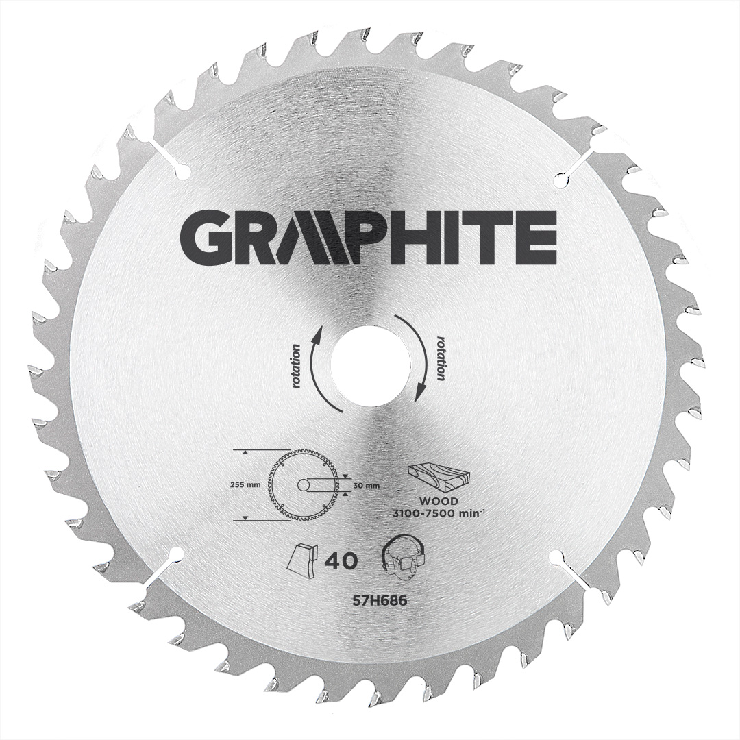 Tarcza do pilarki widiowa GRAPHITE (nr ref. 57H686) o średnicy zewnętrznej 255 mm, wykonana ze stopu stali manganowej MN65 o dużej odporności na temperaturę i odkształcenia. Zęby z nakładkami z węglika spiekanego YG6A pozwalają na średnio dokładne cięcie drewna i materiałów drewnopochodnych, takich jak sklejka, płyta wiórowa, MDF. Zawarte w opakowaniu pierścienie redukcyjne umożliwiają zastosowanie tarczy do większości modeli pilarek.
