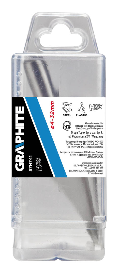 Wiertło bezstopniowe GRAPHITE (nr ref. 57H741) o średnicy od 4 do 32 mm, wykonane ze stali szybkotnącej. Pozwala na wiercenie i rozwiercanie otworów w cienkich blachach stalowych, aluminiowych, miedzianych oraz w elementach z tworzyw sztucznych. Forma stożka pozwala na wiercenie otworów o dowolnej średnicy w podanym zakresie.
