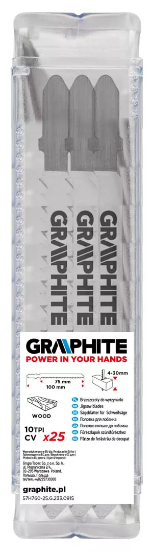 Brzeszczoty do wyrzynarki GRAPHITE (nr ref. 57H760- 25) o podziałce 10TPI i długości 100 mm, służące do dokładnego cięcia drewna i plastiku o grubości 4 - 30 mm. Uchwyt typu T pozwala stosować brzeszczoty we wszystkich wyrzynarkach z uchwytem typu BOSCH i uchwytem uniwersalnym. Zastosowanie stali CrV (chromowo- wanadowej) nadaje brzeszczotom wysoką sprężystość i odporność na wysokie temperatury.