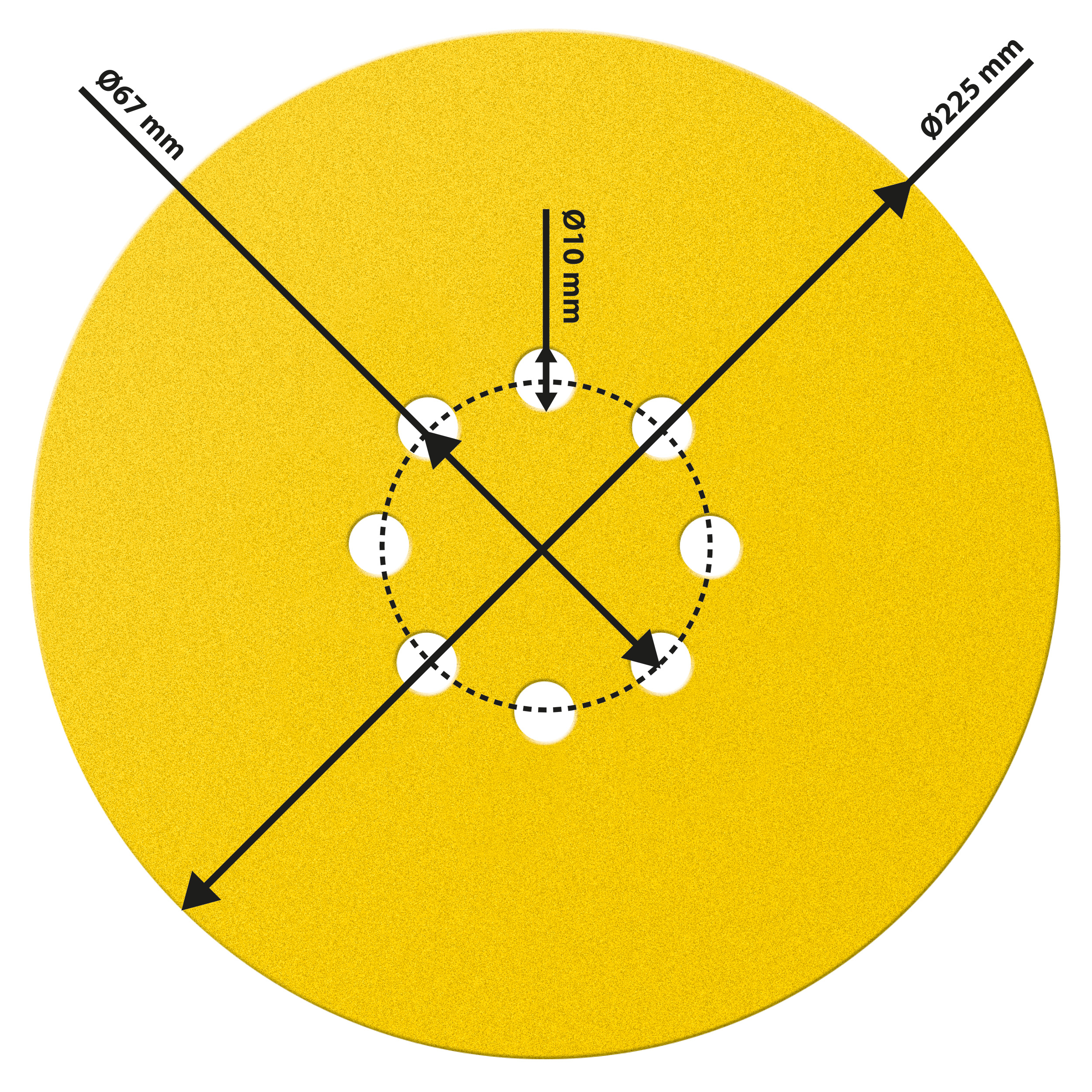 Krążki ścierne GRAPHITE (nr ref. 57H830) o średnicy 225 mm i gradacji K80 z 8 otworami, służące do szlifowania powierzchni gipsowych przy pomocy szlifierek wysięgnikowych. Mocowanie na rzep umożliwia szybką wymianę zużytego krążka.