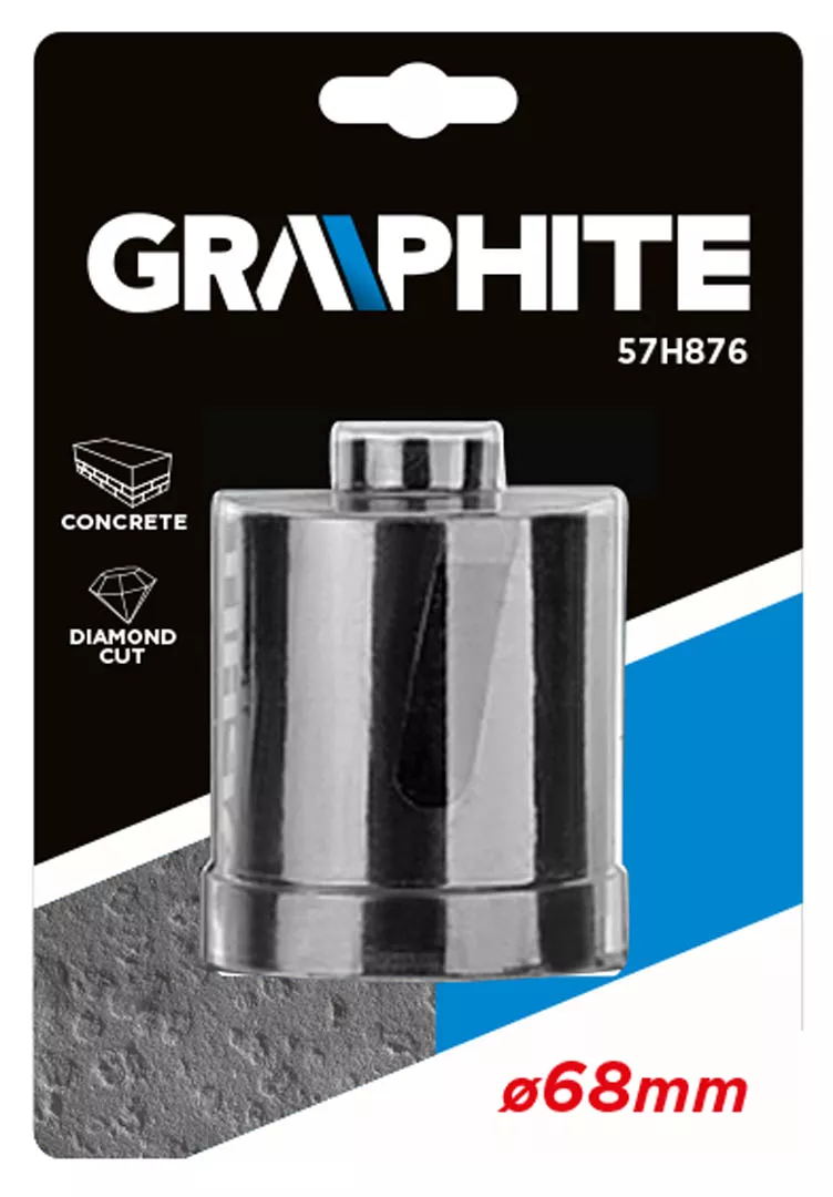 Otwornica diamentowa GRAPHITE (nr ref. 57H876) o średnicy 68 mm, dzięki laserowo spawanym segmentom idealnie nadaje się do ciężkich prac budowlanych. Wysoko wytrzymałe segmenty diamentowe pozwalają wydajnie wiercić otwory w betonie, betonie zbrojonym, granicie, marmurze, kamieniu, cegle itp.,