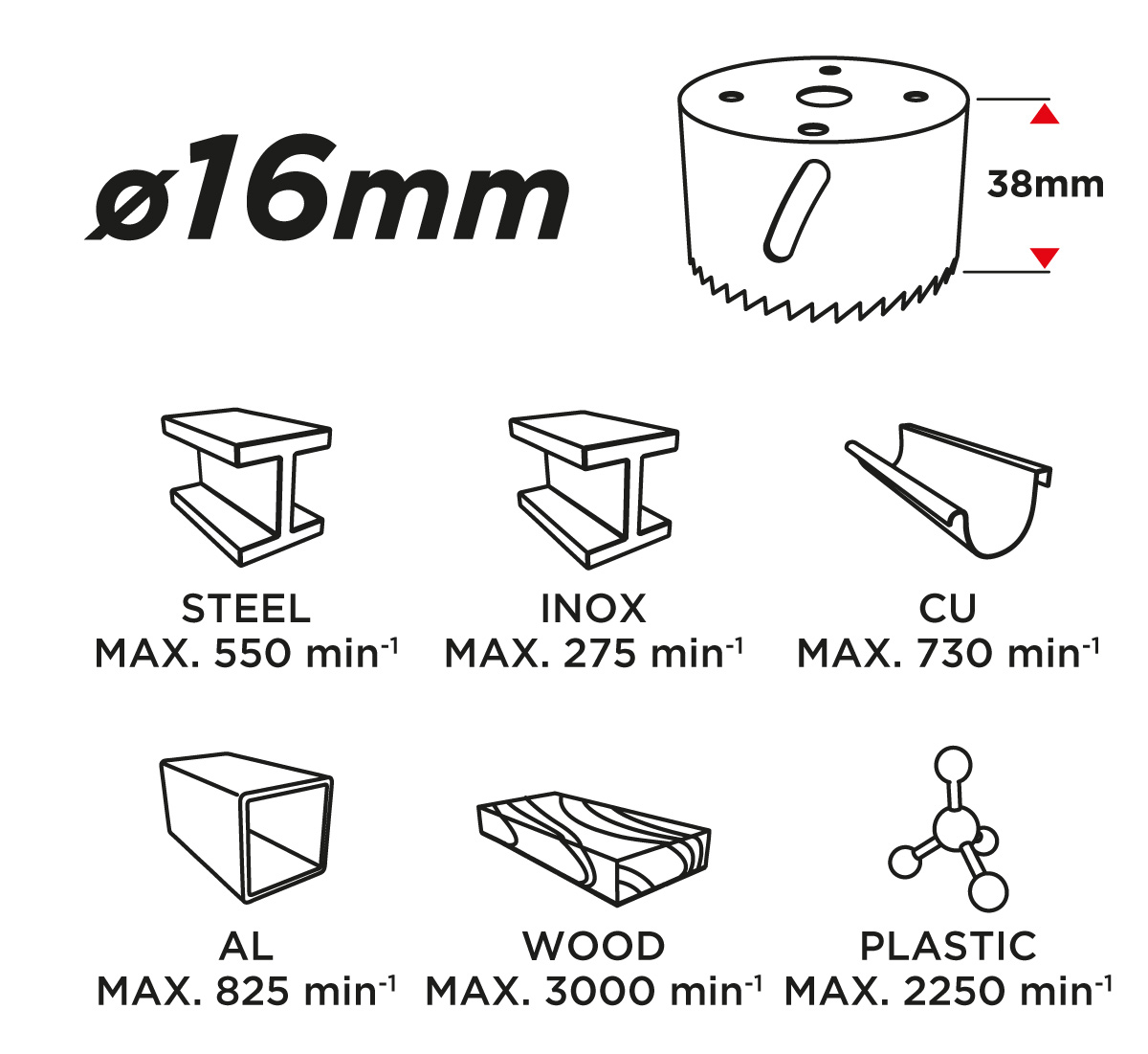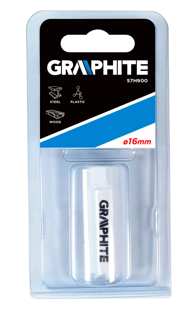 Otwornica bimetalowa GRAPHITE (nr ref. 57H900) o średnicy 16 mm, dzięki progresywnemu uzębieniu, wykonanemu ze stali szybkotnącej, pozwala na wydajne wiercenie precyzyjnych otworów w stali, stali nierdzewnej, drewnie, tworzywach, kompozytach.