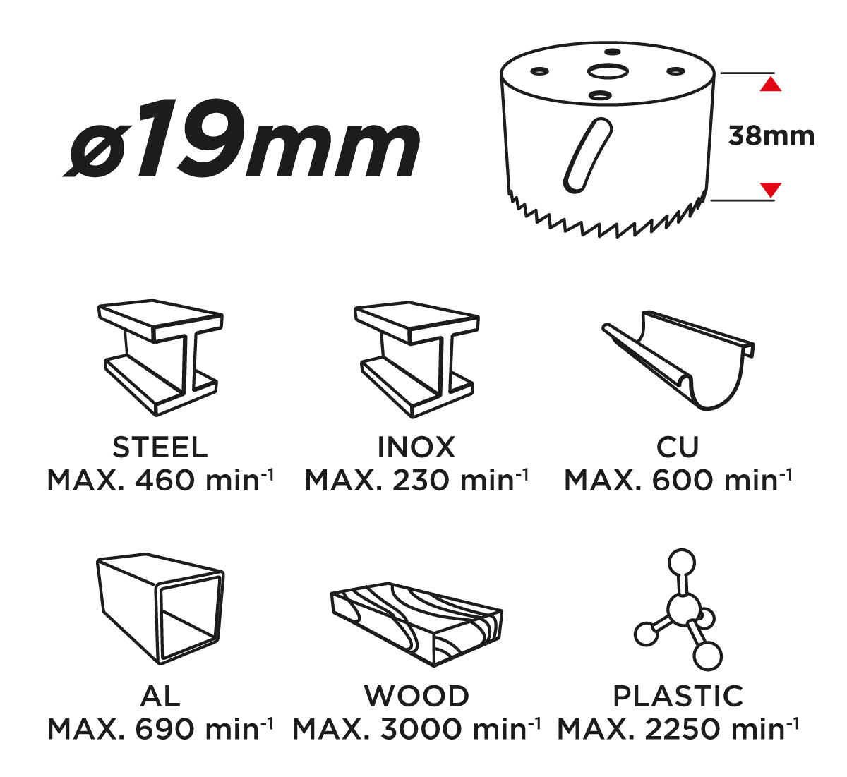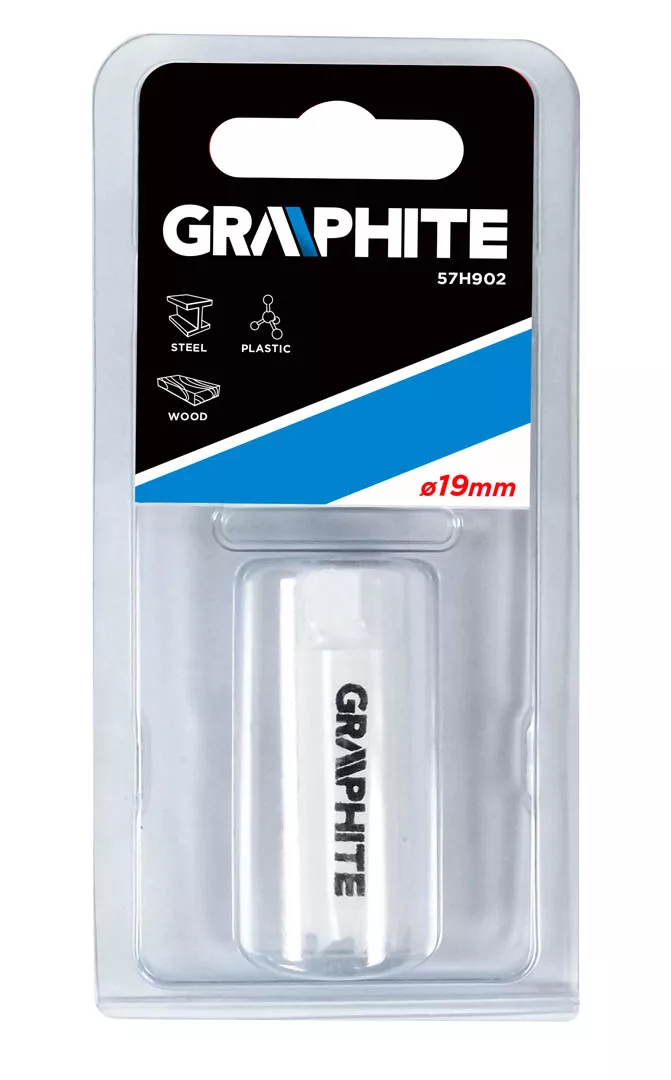 Otwornica bimetalowa GRAPHITE (nr ref. 57H902) o średnicy 19 mm, dzięki progresywnemu uzębieniu, wykonanemu ze stali szybkotnącej, pozwala na wydajne wiercenie precyzyjnych otworów w stali, stali nierdzewnej, drewnie, tworzywach, kompozytach.