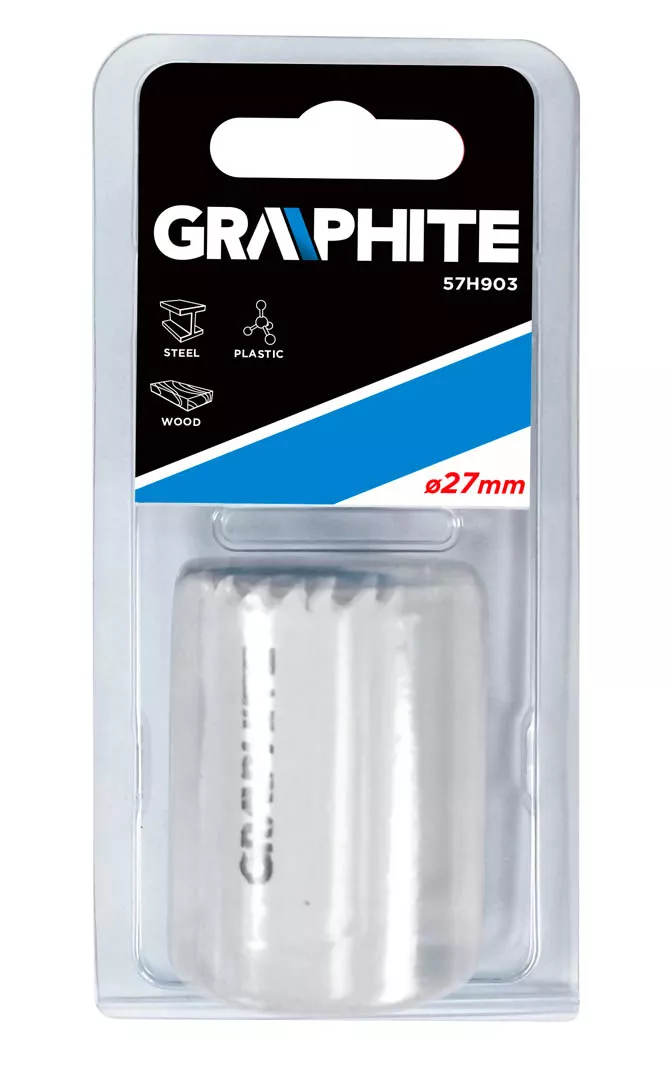 Otwornica bimetalowa GRAPHITE (nr ref. 57H903) o średnicy 27 mm, dzięki progresywnemu uzębieniu, wykonanemu ze stali szybkotnącej, pozwala na wydajne wiercenie precyzyjnych otworów w stali, stali nierdzewnej, drewnie, tworzywach, kompozytach.