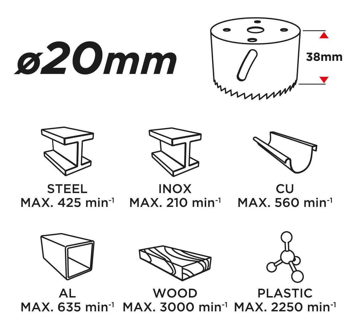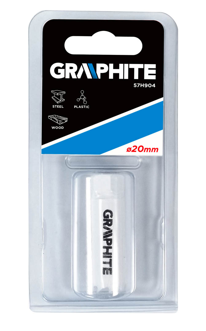 Otwornica bimetalowa GRAPHITE (nr ref. 57H904) o średnicy 20 mm, dzięki progresywnemu uzębieniu, wykonanemu ze stali szybkotnącej, pozwala na wydajne wiercenie precyzyjnych otworów w stali, stali nierdzewnej, drewnie, tworzywach, kompozytach.
