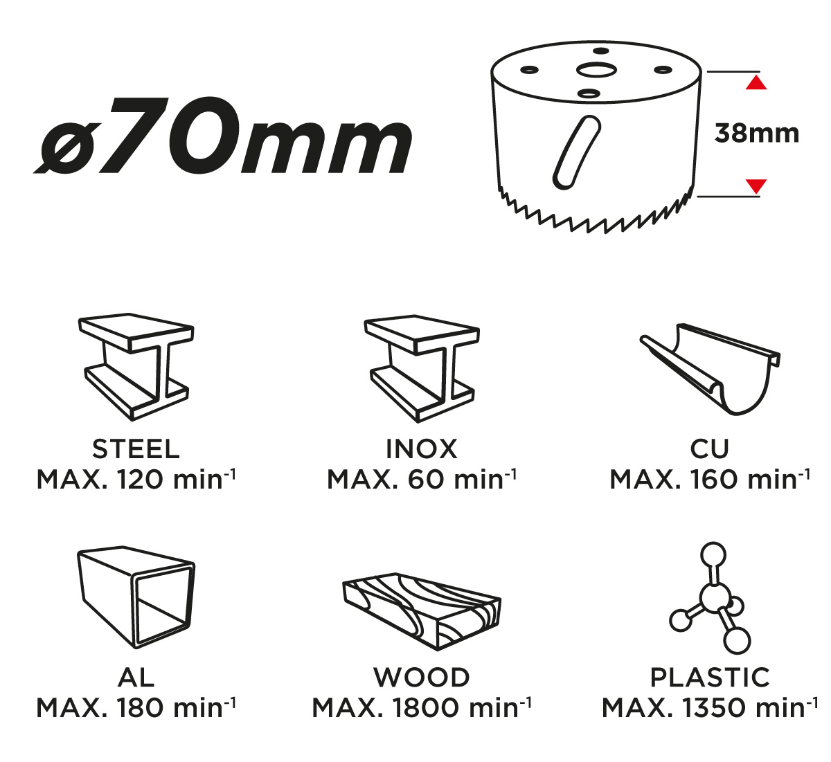 Otwornica bimetalowa GRAPHITE (nr ref. 57H911) o średnicy 70 mm, dzięki progresywnemu uzębieniu, wykonanemu ze stali szybkotnącej, pozwala na wydajne wiercenie precyzyjnych otworów w stali, stali nierdzewnej, drewnie, tworzywach, kompozytach.