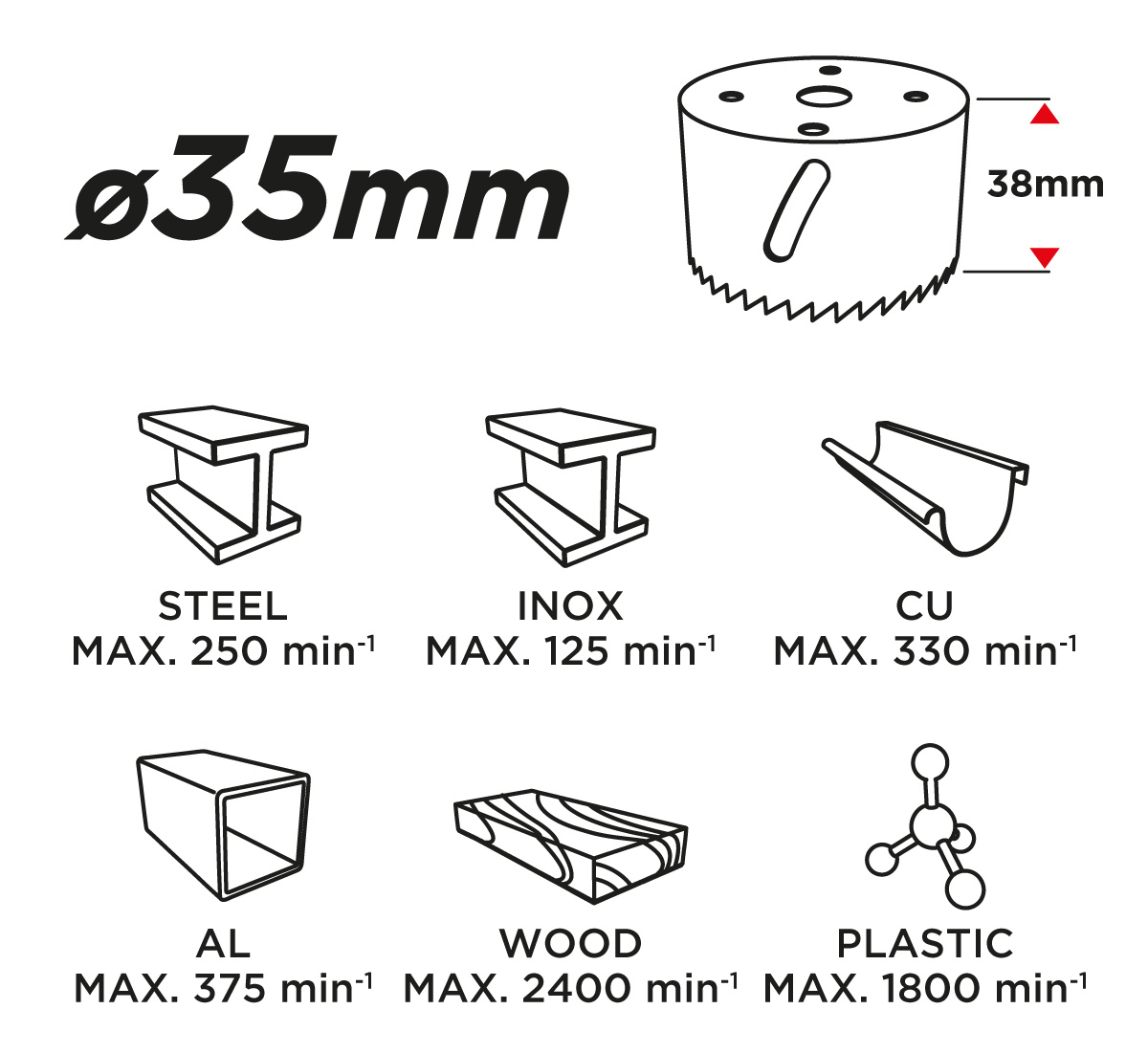 Otwornica bimetalowa GRAPHITE (nr ref. 57H914) o średnicy 35 mm, dzięki progresywnemu uzębieniu, wykonanemu ze stali szybkotnącej, pozwala na wydajne wiercenie precyzyjnych otworów w stali, stali nierdzewnej, drewnie, tworzywach, kompozytach.