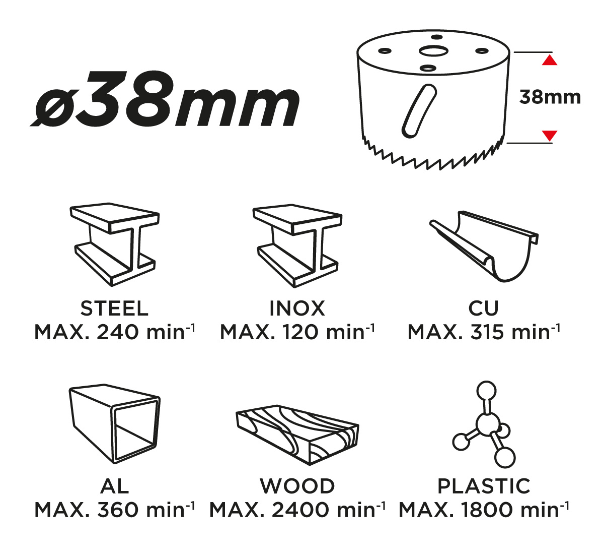 Otwornica bimetalowa GRAPHITE (nr ref. 57H916) o średnicy 38 mm, dzięki progresywnemu uzębieniu, wykonanemu ze stali szybkotnącej, pozwala na wydajne wiercenie precyzyjnych otworów w stali, stali nierdzewnej, drewnie, tworzywach, kompozytach.