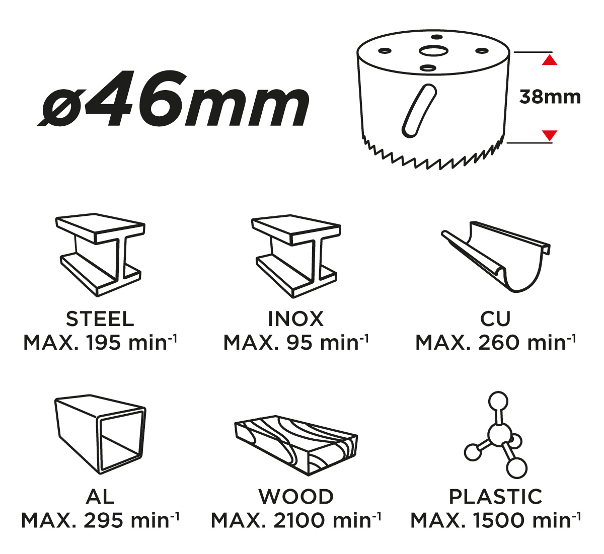 Otwornica bimetalowa GRAPHITE (nr ref. 57H920) o średnicy 46 mm, dzięki progresywnemu uzębieniu, wykonanemu ze stali szybkotnącej, pozwala na wydajne wiercenie precyzyjnych otworów w stali, stali nierdzewnej, drewnie, tworzywach, kompozytach.