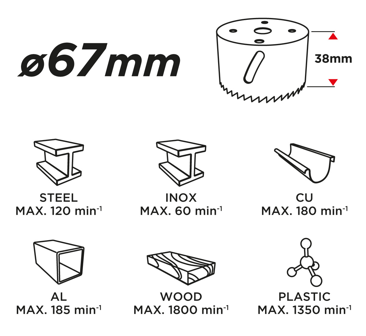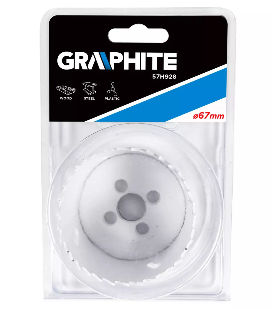 Otwornica bimetalowa GRAPHITE (nr ref. 57H928) o średnicy 67 mm, dzięki progresywnemu uzębieniu, wykonanemu ze stali szybkotnącej, pozwala na wydajne wiercenie precyzyjnych otworów w stali, stali nierdzewnej, drewnie, tworzywach, kompozytach.