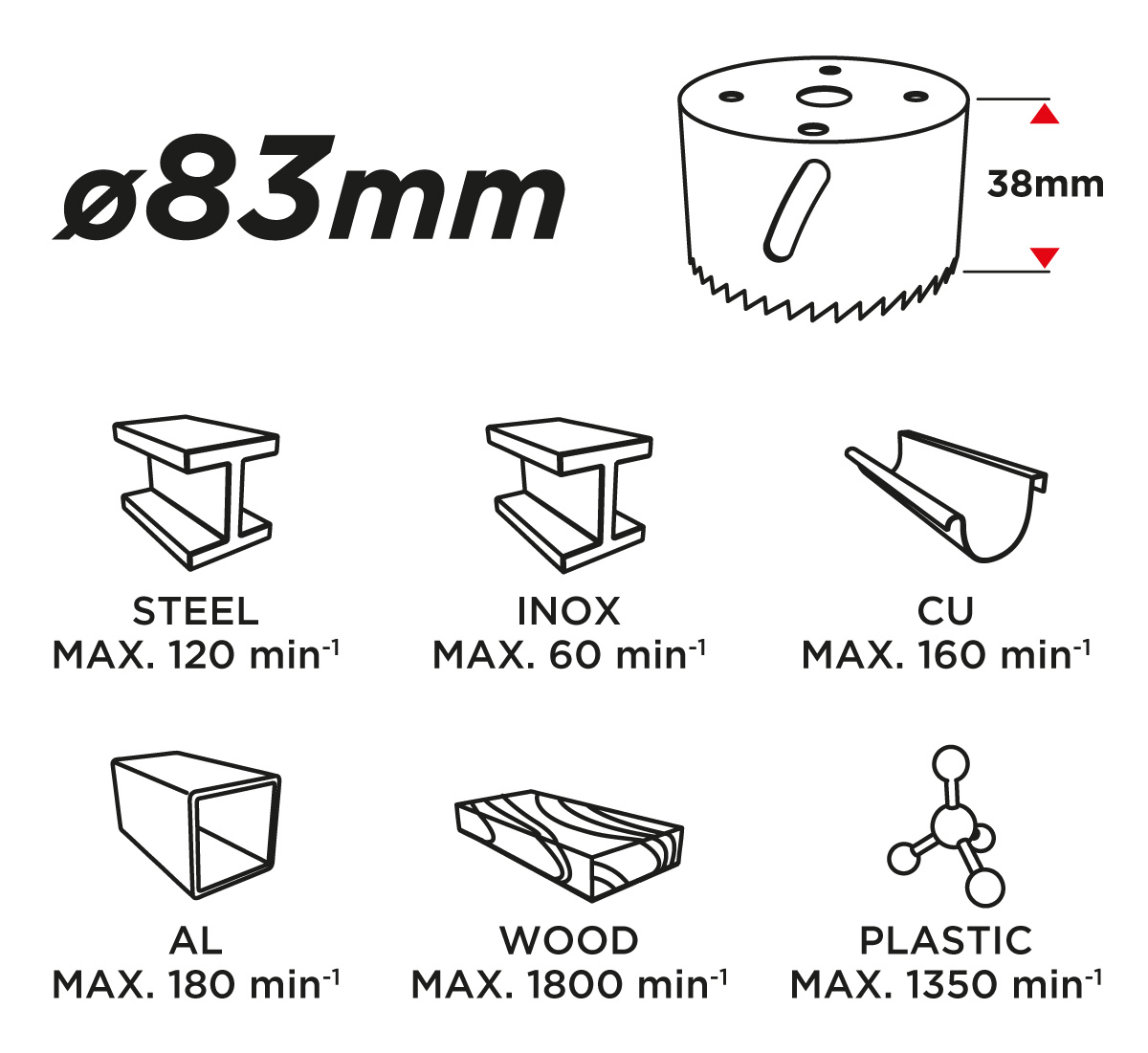 Otwornica bimetalowa GRAPHITE (nr ref. 57H932) o średnicy 83 mm, dzięki progresywnemu uzębieniu, wykonanemu ze stali szybkotnącej, pozwala na wydajne wiercenie precyzyjnych otworów w stali, stali nierdzewnej, drewnie, tworzywach, kompozytach.
