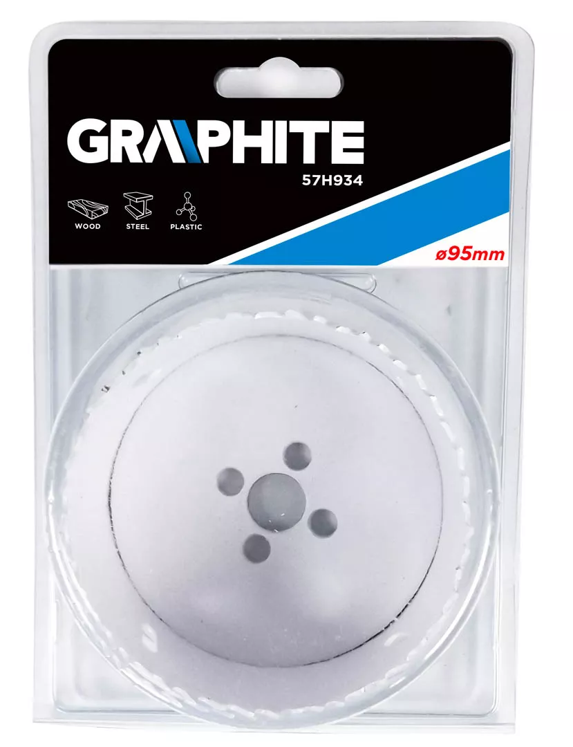 Otwornica bimetalowa GRAPHITE (nr ref. 57H934) o średnicy 95 mm, dzięki progresywnemu uzębieniu, wykonanemu ze stali szybkotnącej, pozwala na wydajne wiercenie precyzyjnych otworów w stali, stali nierdzewnej, drewnie, tworzywach, kompozytach.