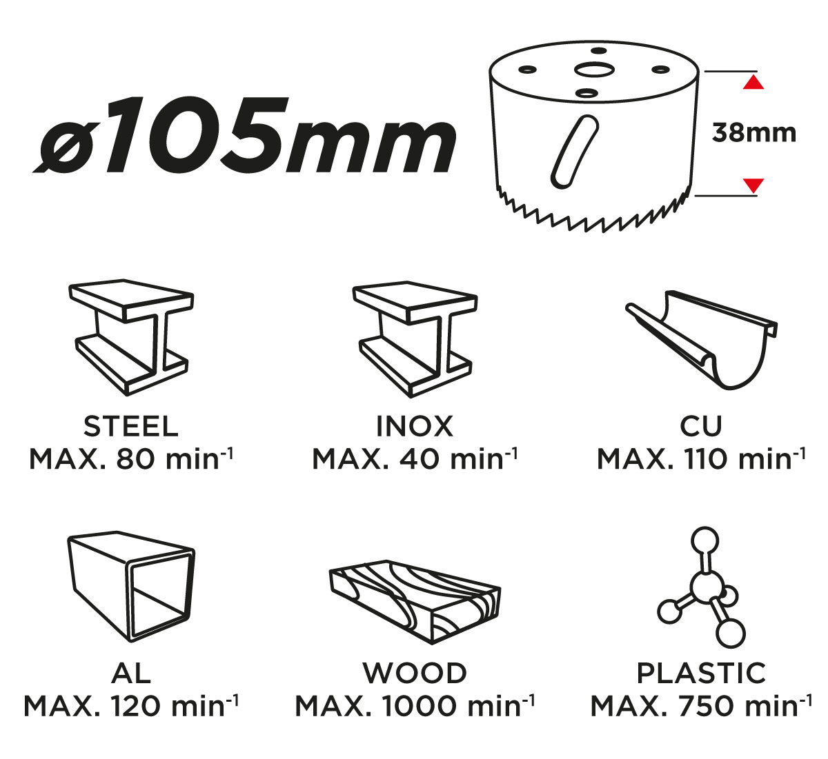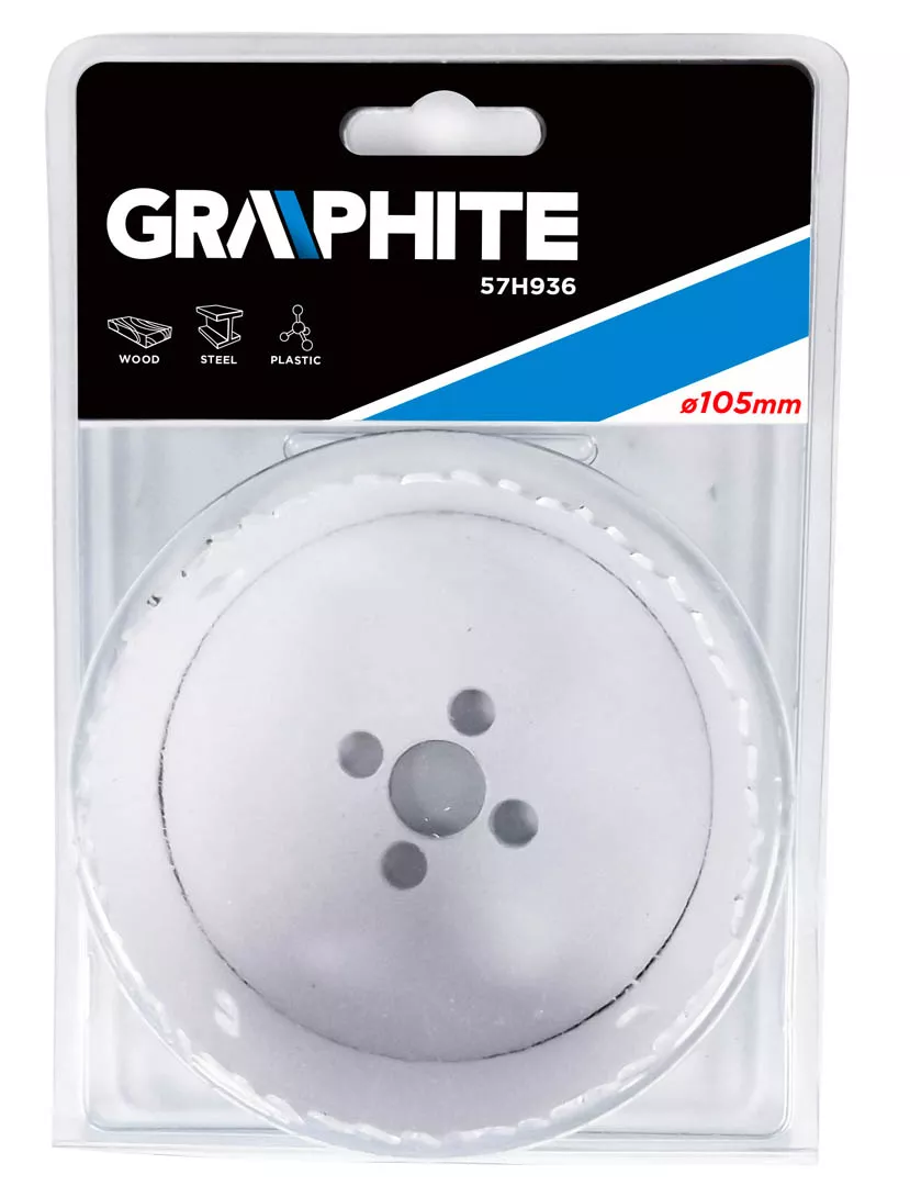 Otwornica bimetalowa GRAPHITE (nr ref. 57H936) o średnicy 105 mm, dzięki progresywnemu uzębieniu, wykonanemu ze stali szybkotnącej, pozwala na wydajne wiercenie precyzyjnych otworów w stali, stali nierdzewnej, drewnie, tworzywach, kompozytach.