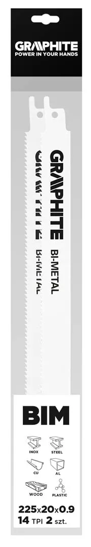 Brzeszczoty bagnetowe GRAPHITE (nr ref. 57H947) posiadają uzębienie ze stali szybkotnącej o podziałce 10TPI (10 zębów na cal długości ostrza). Dzięki połączeniu stali szybkotnącej ze stalą chromowo- wanadową, ostrza nadają się do cięcia wszelkich elementów wykonanych ze stali, stali nierdzewnej, plastiku, drewna. Połączenie tych dwóch gatunków stali zapewnia ostrzu wyjątkową elastyczność, co pozwala pracować ugiętym ostrzem. Daje to możliwość cięcia w trudno dostępnych miejscach.