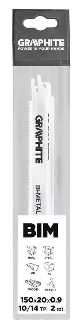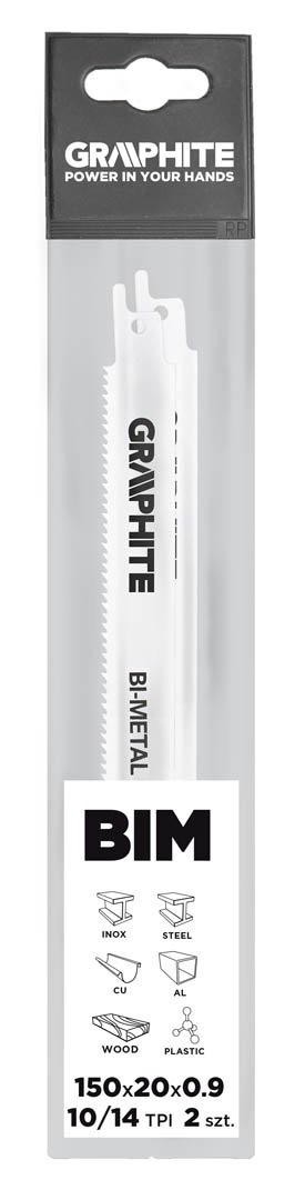 Brzeszczoty bagnetowe GRAPHITE (nr ref. 57H950) posiadają uzębienie ze stali szybkotnącej o podziałce progresywnej 10/14TPI (na przemian 10 i 14 zębów na cal długości ostrza). Dzięki połączeniu stali szybkotnącej ze stalą chromowo- wanadową, ostrza nadają się do cięcia wszelkich elementów wykonanych ze stali, stali nierdzewnej, plastiku, drewna. Połączenie tych dwóch gatunków stali zapewnia ostrzu wyjątkową elastyczność, co pozwala pracować ugiętym ostrzem. Daje to możliwość cięcia w trudno dostępnych miejscach.