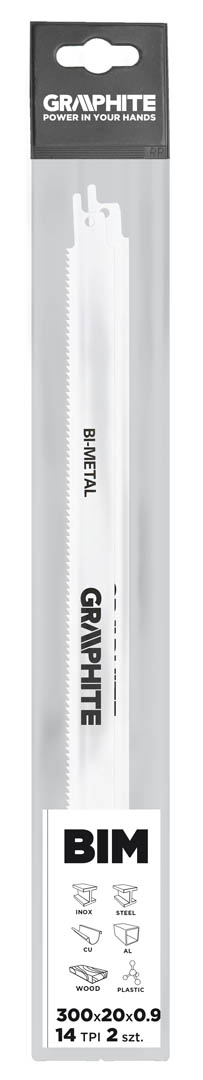 Brzeszczoty bagnetowe GRAPHITE (nr ref. 57H952) posiadają uzębienie ze stali szybkotnącej o podziałce 14TPI (14 zębów na cal długości ostrza). Dzięki połączeniu stali szybkotnącej ze stalą chromowo- wanadową, ostrza nadają się do cięcia wszelkich elementów wykonanych ze stali, stali nierdzewnej, plastiku, drewna. Połączenie tych dwóch gatunków stali zapewnia ostrzu wyjątkową elastyczność, co pozwala pracować ugiętym ostrzem. Daje to możliwość cięcia w trudno dostępnych miejscach.