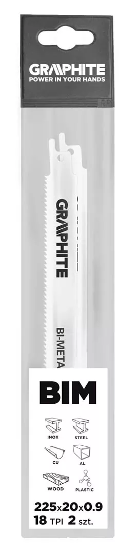 Brzeszczoty bagnetowe GRAPHITE (nr ref. 57H953) posiadają uzębienie ze stali szybkotnącej o podziałce 18TPI (18 zębów na cal długości ostrza). Dzięki połączeniu stali szybkotnącej ze stalą chromowo- wanadową, ostrza nadają się do cięcia wszelkich elementów wykonanych ze stali, stali nierdzewnej, plastiku, drewna. Połączenie tych dwóch gatunków stali zapewnia ostrzu wyjątkową elastyczność, co pozwala pracować ugiętym ostrzem. Daje to możliwość cięcia w trudno dostępnych miejscach.