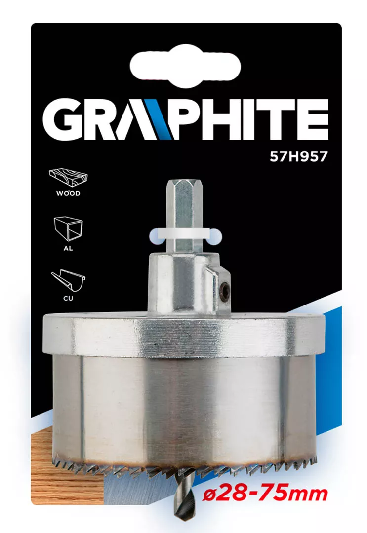 Zestaw otwornic GRAPHITE (nr ref. 57H957) 5 szt. o średnicach od 28 do 75 mm i maksymalnej głębokości wiercenia 30 mm, dzięki hartowanym zębom koronek pozwala wydajnie wiercić otwory zarówno w drewnie, jak i aluminium, miedzi, laminatach i tworzywach. Wysoką wytrzymałość otwornicy uzyskano przez wykonanie trzpienia mocującego i tarczy kotwicznej do koronek z jednego kawałka metalu.