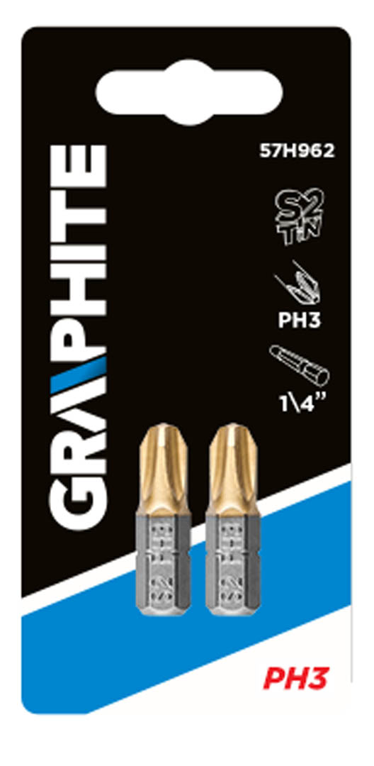 Końcówki wkrętakowe GRAPHITE (nr ref. 57H962) typu PH3, przeznaczone do wkręcania/wykręcania wkrętów i śrub z łbem typu Phillips o rozmiarze 1 mm. Pokrycie powierzchni końcówek azotkiem tytanu (złoty kolor) znacząco przedłuża żywotność narzędzia poprzez utwardzenie punktu styku z łbem śruby.