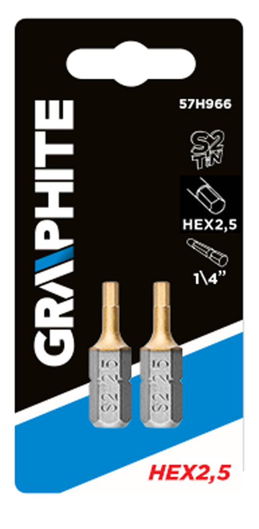 Końcówki wkrętakowe GRAPHITE (nr ref. 57H966) typu HEX2.5, przeznaczone do wkręcania/wykręcania wkrętów i śrub posiadających łeb z otworem sześciokątnym o rozmiarze 2.5 mm. Pokrycie powierzchni końcówek azotkiem tytanu (złoty kolor) znacząco przedłuża żywotność narzędzia poprzez utwardzenie punktu styku z łbem śruby.