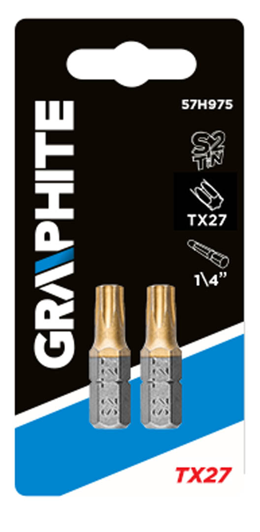 Końcówki wkrętakowe GRAPHITE (nr ref. 57H975) typu TX27, przeznaczone do wkręcania/wykręcania wkrętów i śrub z łbem typu Torx o rozmiarze 27 mm. Pokrycie powierzchni końcówek azotkiem tytanu (złoty kolor) znacząco przedłuża żywotność narzędzia poprzez utwardzenie punktu styku z łbem śruby.