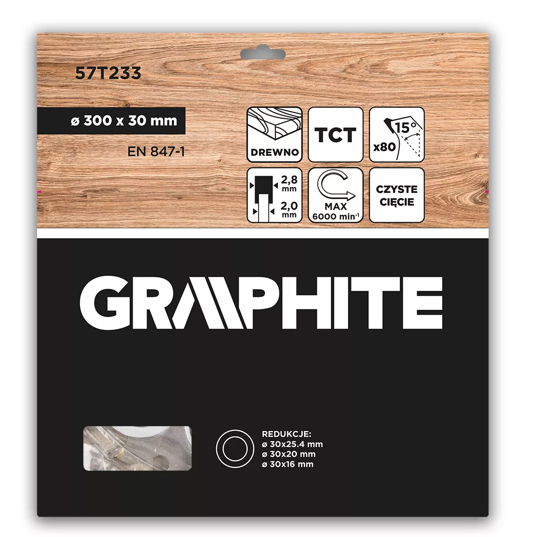 Tarcza do pilarki, widiowa, 300 x 30 mm, 80 zębów 57T233 marki GRAPHITE, o średnicy zewnętrznej 300 mm i średnicy otworu montażowego 30 mm. Posiada 80 zębów, szerokość rzazu wynosi 2,8 mm, a kąt zęba to 15°. Maksymalna prędkość obrotowa wynosi 6 000 obr./min. Charakteryzuje się szybkim rodzajem cięciem. Tarcza zgodna jest z normą EN 847-1. W zestawie znajdują się pierścienie redukcyjne 30/25,4 mm, 30/20 mm i 30/16 mm. Tarcza do pilarki marki GRAPHITE przeznaczona jest do cięcia drewna i materiałów drewnopochodnych, takich jak sklejka, płyta wiórowa i MDF. Zawarte w opakowaniu pierścienie redukcyjne umożliwiają zastosowanie tarczy do większości modeli pilarek.