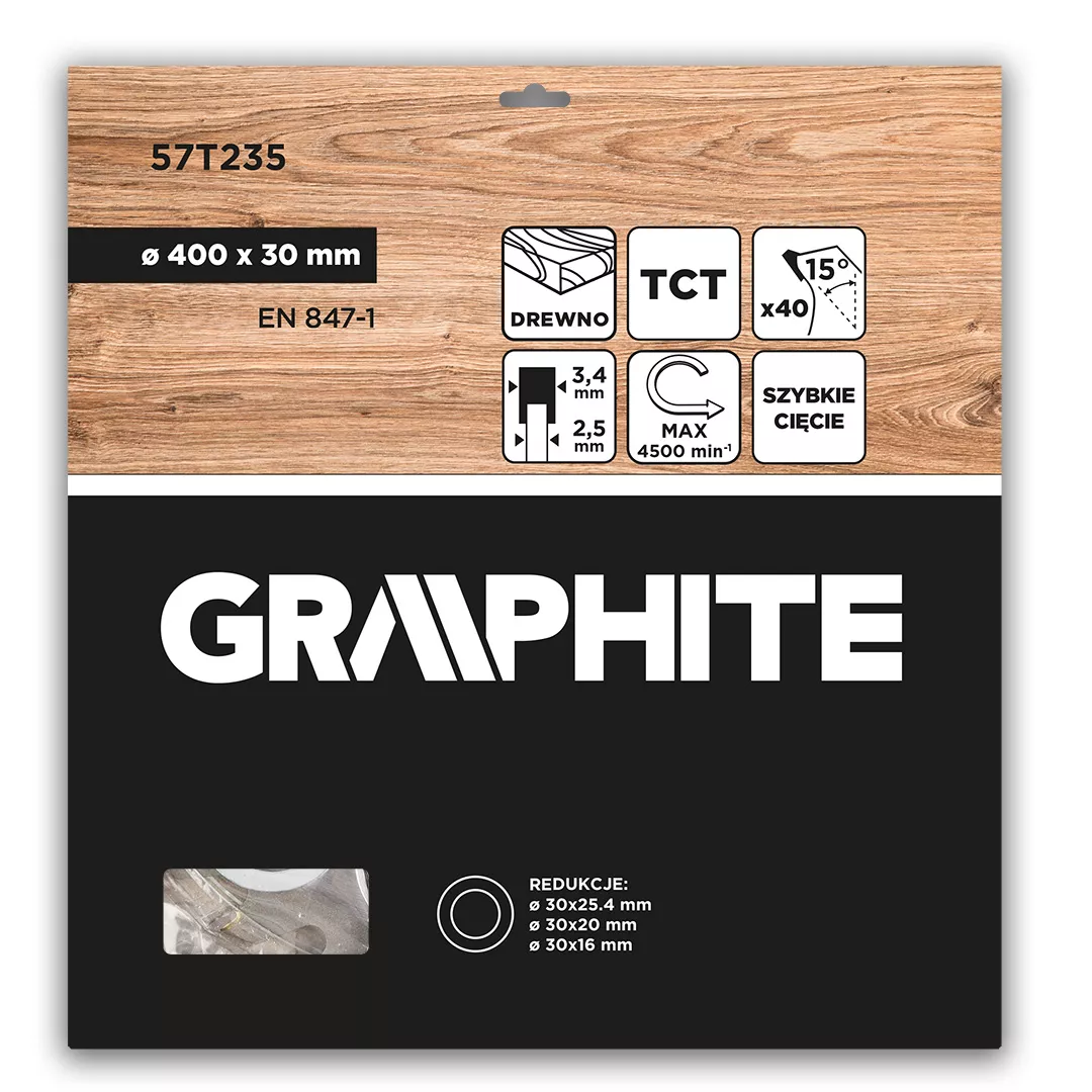 Tarcza do pilarki, widiowa, 400 x 30 mm, 40 zębów 57T235 marki GRAPHITE, o średnicy zewnętrznej 400 mm i średnicy otworu montażowego 30 mm. Posiada 40 zębów, szerokość rzazu wynosi 3,4 mm, a kąt zęba to 15°. Maksymalna prędkość obrotowa wynosi 4 500 obr./min. Charakteryzuje się szybkim rodzajem cięciem. Tarcza zgodna jest z normą EN 847-1. W zestawie znajdują się pierścienie redukcyjne 30/25,4 mm, 30/20 mm i 30/16 mm. Tarcza do pilarki marki GRAPHITE przeznaczona jest do cięcia drewna i materiałów drewnopochodnych, takich jak sklejka, płyta wiórowa i MDF. Zawarte w opakowaniu pierścienie redukcyjne umożliwiają zastosowanie tarczy do większości modeli pilarek.