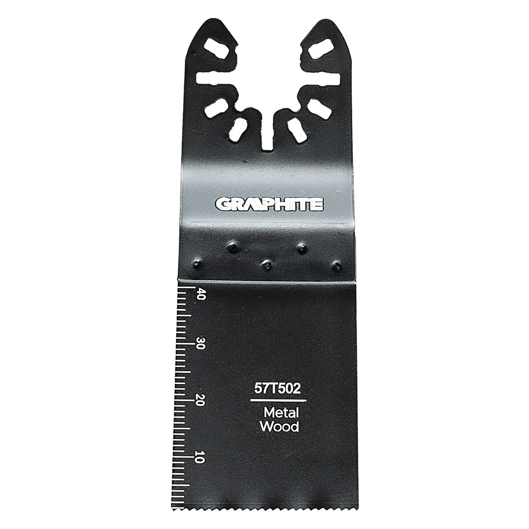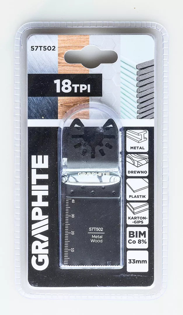Brzeszczot do urządzenia wielofunkcyjnego, do cięcia wgłębnego, BIM Co 8%, 33 mm 57T502 marki GRAPHITE to narzędzie do urządzeń wielofunkcyjnych o szerokości ostrza 33 mm. Zostało wykonane z bimetalu (BIM) z dodatkiem 8% kobaltu (Co8%). Brzeszczot GRAPHITE przeznaczony jest do cięcia wgłębnego drewna, drewna z gwoździami, metalu, tworzyw sztucznych oraz płyt gipsowo-kartonowych. Posiada rozstaw zęba 1,4 mm, 18 TPI, maksymalną głębokość cięcia 40 mm oraz grubość ostrza 0,8 mm. Rekomendowany do precyzyjnych prac w różnorodnych materiałach.