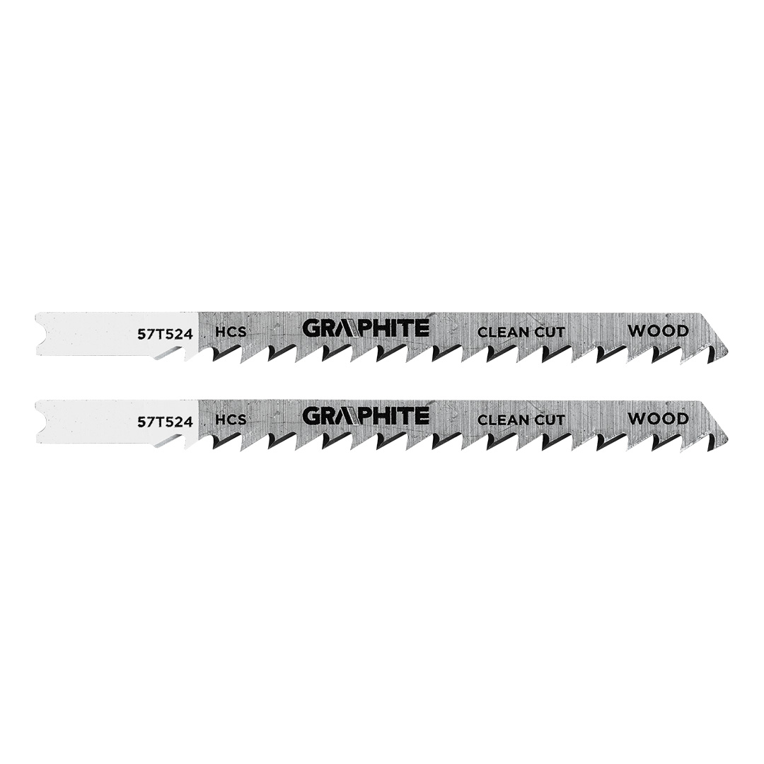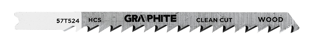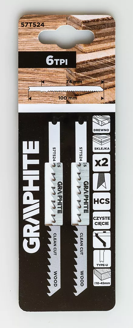 Brzeszczot do wyrzynarki, 6 TPI, HCS, uchwyt typu U, 2 sztuki, czyste cięcie 57T524 marki GRAPHITE to brzeszczot o gęstości uzębienia 6 TPI, wykonany z HCS oraz wyposażony w uchwyt typu U. W komplecie znajdują się 2 sztuki. Jego długość całkowita wynosi 100 mm, długość robocza 74 mm, szerokość 8 mm, grubość 1,5 mm, a rozstaw zębów 4 mm. Przeznaczony do cięcia drewna iglastego, płyty wiórowej, sklejki stolarskiej oraz płyt pilśniowych o grubości 10–45 mm. Brzeszczot marki GRAPHITE umożliwia czyste cięcie.