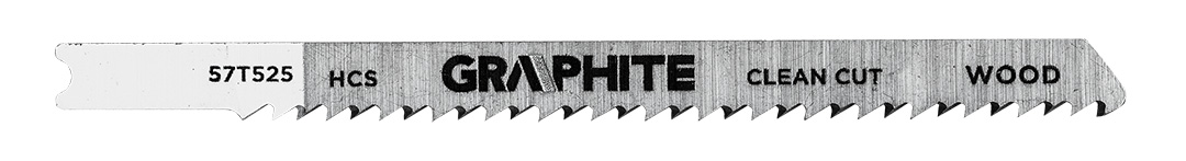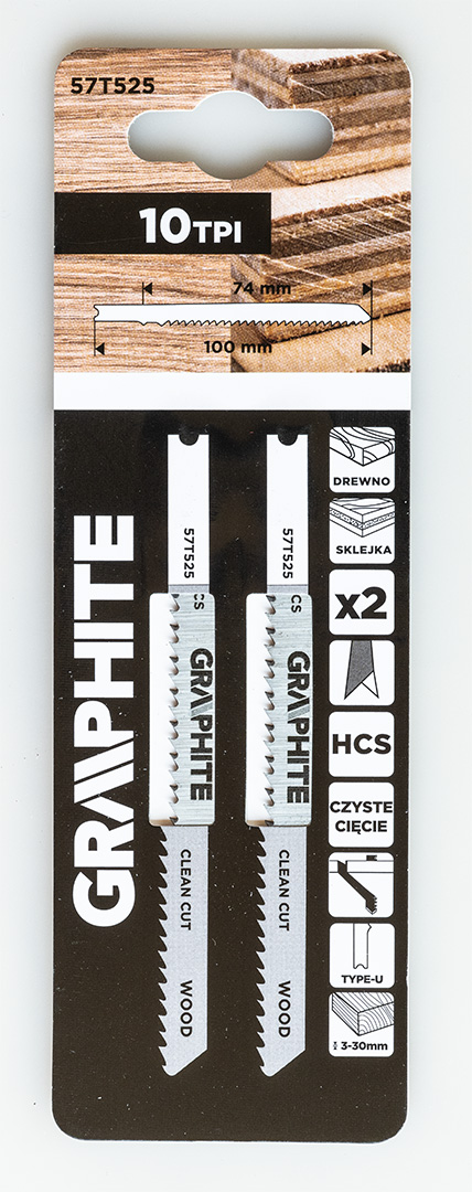 Brzeszczot do wyrzynarki, 10 TPI, HCS, uchwyt typu U, 2 sztuki, czyste cięcie 57T525 marki GRAPHITE to brzeszczot o gęstości uzębienia 10 TPI, wykonany z HCS oraz wyposażony w uchwyt typu U. W komplecie znajdują się 2 sztuki. Jego długość całkowita wynosi 100 mm, długość robocza 74 mm, szerokość 8 mm, grubość 1,5 mm, a rozstaw zębów 2,5 mm. Przeznaczony do cięcia drewna iglastego, płyty wiórowej, sklejki stolarskiej, płyt pilśniowych o grubości 3–30 mm oraz tworzy sztucznych/epoksydu (średnica <30 mm). Brzeszczot marki GRAPHITE umożliwia czyste cięcie.