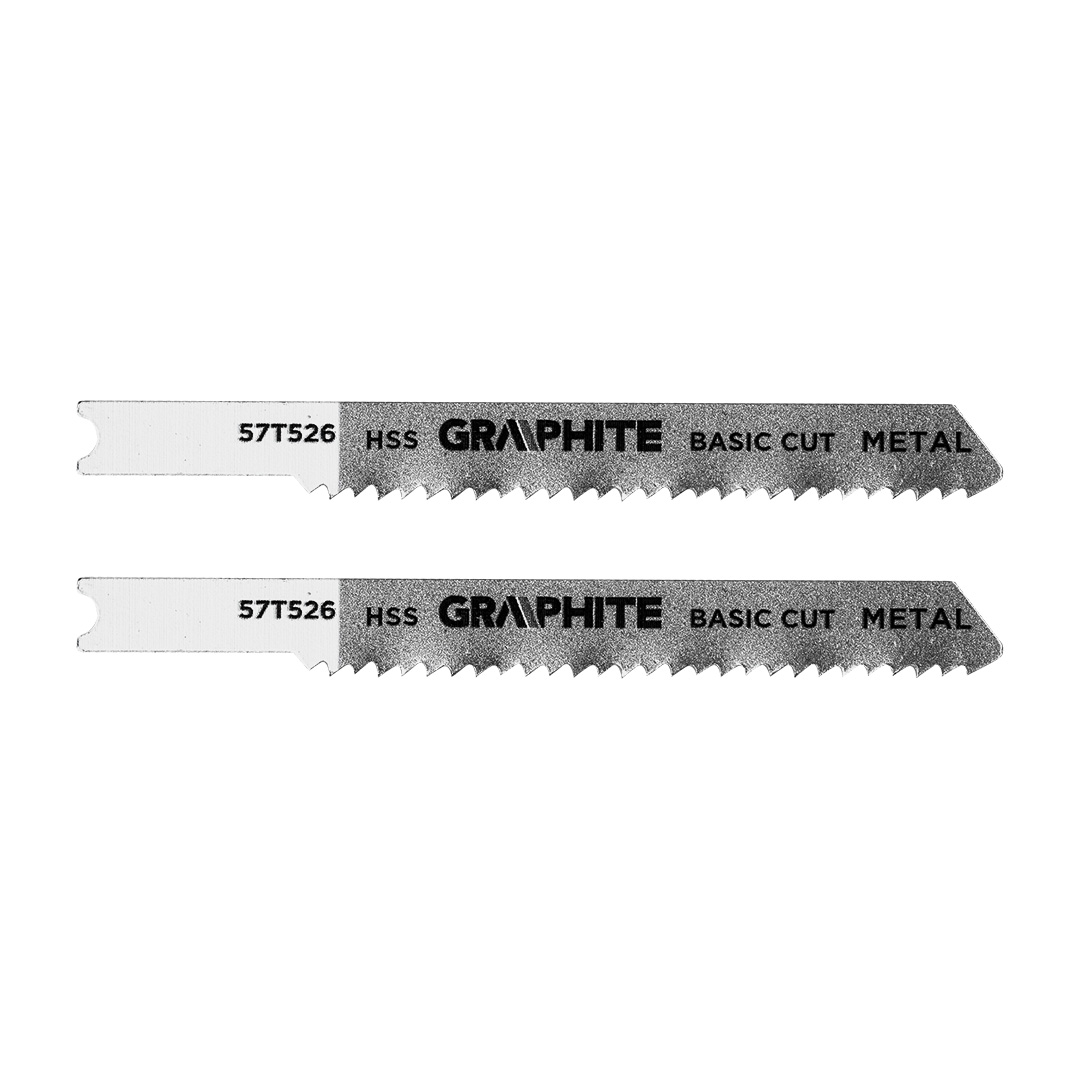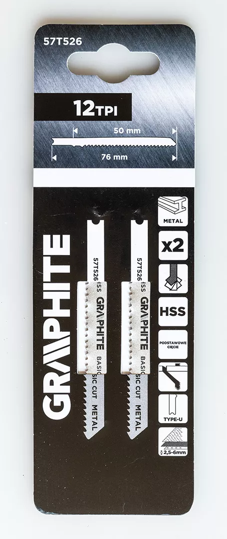Brzeszczot do wyrzynarki, 12 TPI, HSS, uchwyt typu U, 2 sztuki 57T526 marki GRAPHITE to brzeszczot o gęstości uzębienia 12 TPI, wykonany z HSS oraz wyposażony w uchwyt typu U. W komplecie znajdują się 2 sztuki. Jego długość całkowita wynosi 76 mm, długość robocza 50 mm, szerokość 8 mm, grubość 1 mm, a rozstaw zębów 2 mm. Przeznaczony do prac z blachą średniogrubą (2,5-6 mm). Brzeszczot marki GRAPHITE umożliwia podstawowe cięcie.