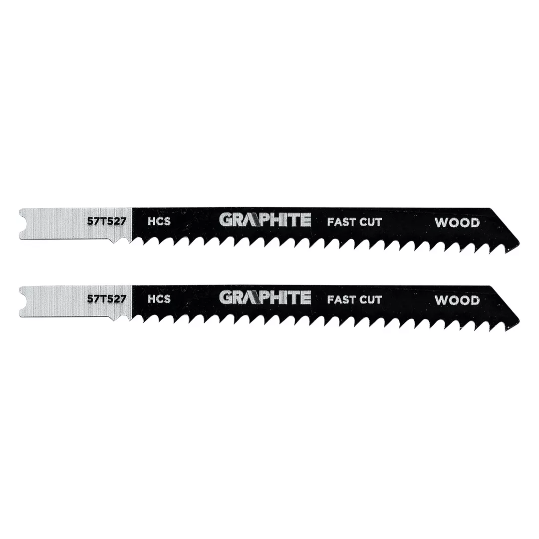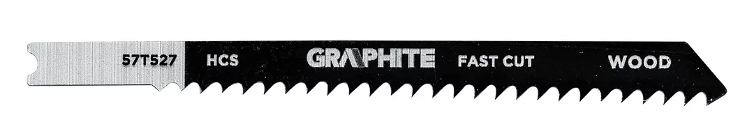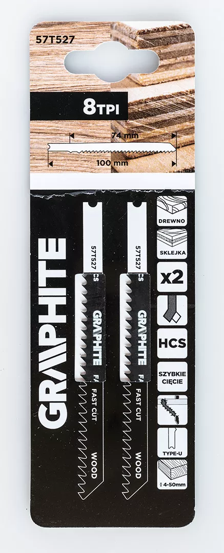 Brzeszczot do wyrzynarki, 8 TPI, HCS, uchwyt typu U, 2 sztuki, zgrubne cięcie 57T527 marki GRAPHITE to narzędzie do wyrzynarki o gęstości uzębienia 8 TPI. Wykonane z HCS, posiada uchwyt typu U. Składa się na 2 sztuki w komplecie. Długość całkowita brzeszczotu marki GRAPHITE wynosi 100 mm, długość robocza 74 mm, szerokość 9,2 mm, grubość 1,2 mm, a jego rozstaw zębów to 3 mm. Charakteryzuje się szerokim zastosowaniem do pracy z drewnem iglastym (4–50 mm), płytami wiórowymi, sklejką stolarską i płytami pilśniowymi. Przeznaczony do szybkiego oraz zgrubnego cięcia.