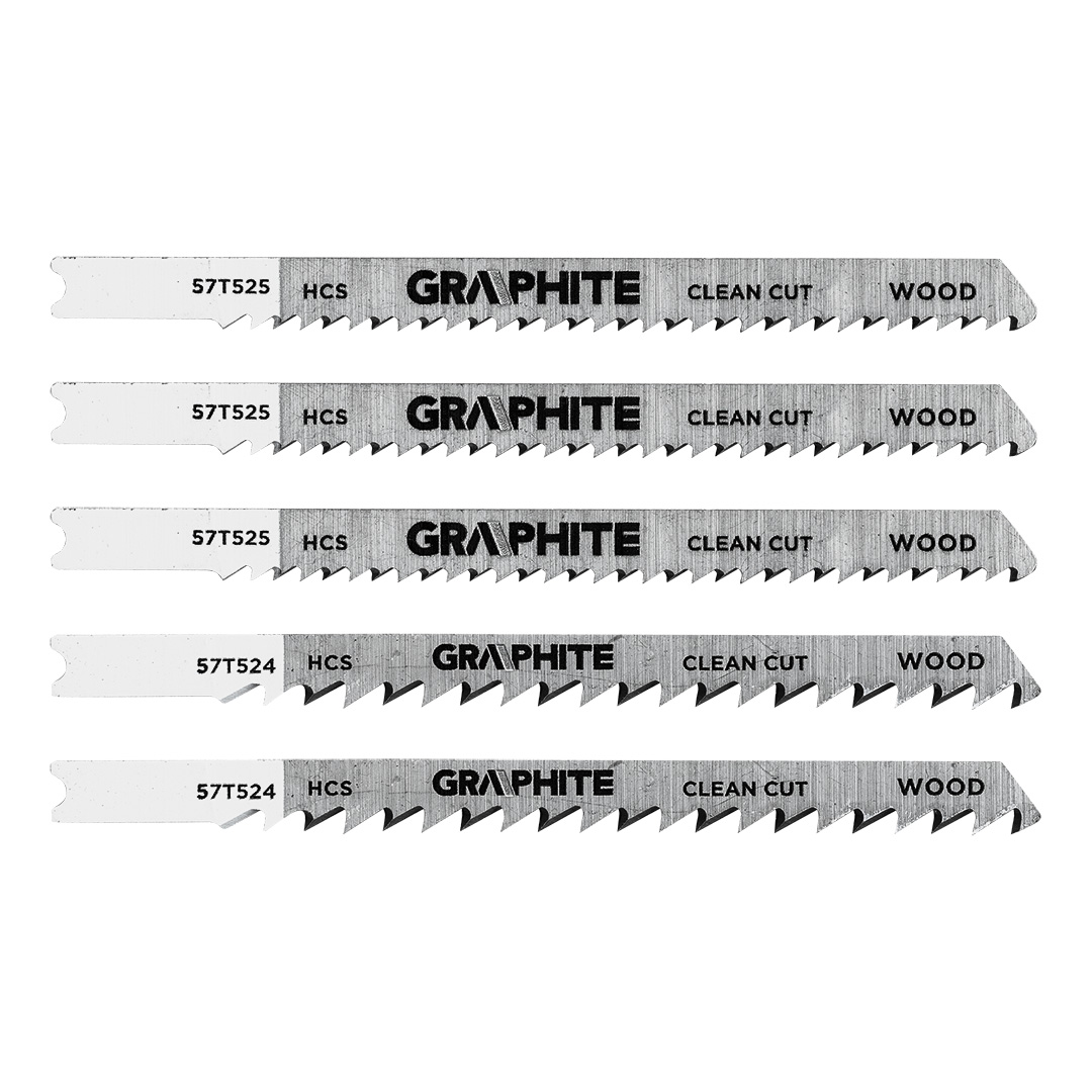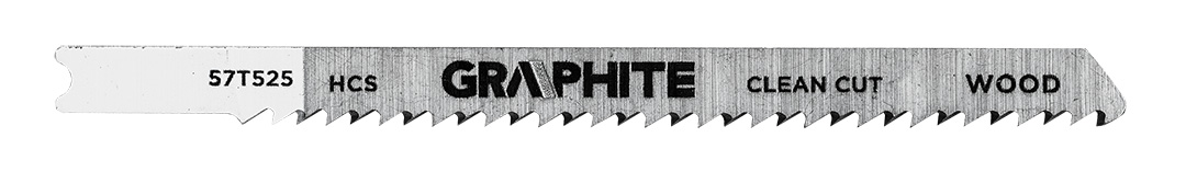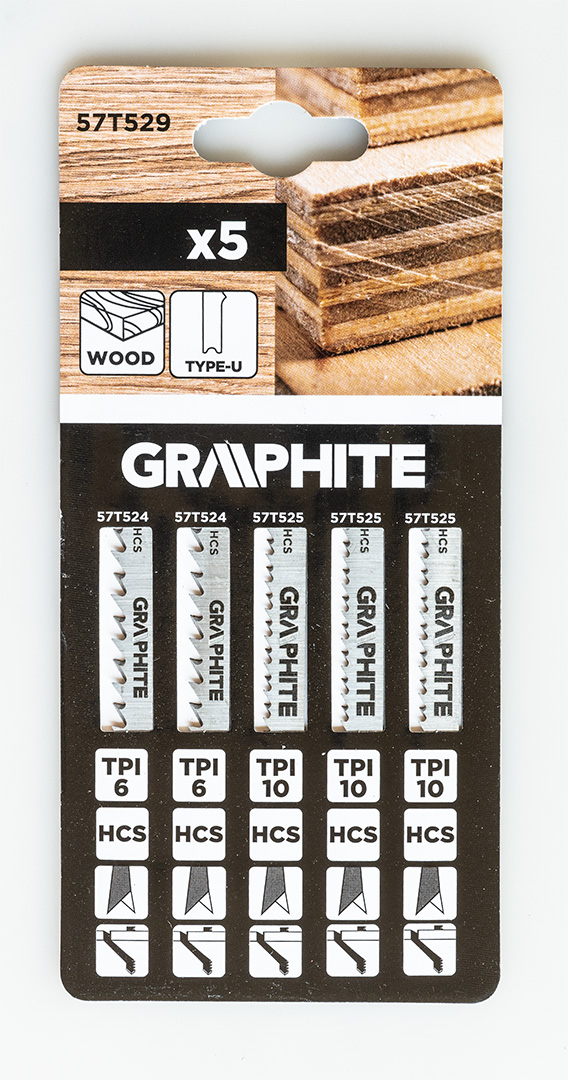 Zestaw brzeszczotów do wyrzynarki, 6 TPI, 10 TPI, HCS, uchwyt typu U, 5 sztuk 57T529 marki GRAPHITE to zestaw składający się na brzeszczoty z HCS oraz z uchwytami typu U, w dwóch rodzajach: brzeszczoty do wyrzynarki 57T524 GRAPHITE (2 sztuki), o gęstości uzębienia 6 TPI, długości całkowitej 100 mm, długości roboczej: 74 mm, szerokości: 8 mm, grubości: 1,5 mm oraz rozstawie zębów: 4 mm. Brzeszczot ten charakteryzuje się zastosowaniem do drewna iglastego, płyt wiórowych, sklejki, płyt pilśniowych (10–45 mm). A także brzeszczoty do wyrzynarki 57T525 (3 sztuki), o gęstości uzębienia 10 TPI, długości całkowitej 100 mm, długości roboczej: 74 mm, szerokości: 8 mm, grubości: 1,5 mm oraz rozstawie zębów: 2,5 mm. Zastosowanie tego modelu to: drewno iglaste, płyta wiórowa, sklejka stolarska, płyty pilśniowe (3–30 mm), tworzywa sztuczne/epoksyd (średnica <30 mm). Oba rodzaje brzeszczotów GRAPHIE zapewniają czyste cięcie.