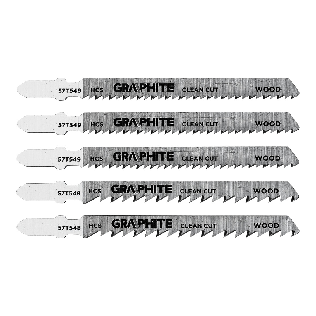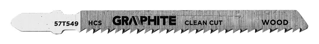 Zestaw brzeszczotów do wyrzynarki, 6 TPI, 10 TPI, HCS, uchwyt typu T, 5 sztuk 57T551 marki GRAPHITE to zestaw składający się na brzeszczoty z HCS oraz z uchwytami typu T, w dwóch rodzajach: brzeszczoty do wyrzynarki 57T548 GRAPHITE (2 sztuki), o gęstości uzębienia 6 TPI, długości całkowitej 100 mm, długości roboczej: 74 mm, szerokości: 8 mm, grubości: 1,5 mm oraz rozstawie zębów: 4 mm. Brzeszczot ten charakteryzuje się zastosowaniem do drewna iglastego, płyt wiórowych, sklejki, płyt pilśniowych (10–45 mm). A także brzeszczoty do wyrzynarki 57T549 (3 sztuki), o gęstości uzębienia 10 TPI, długości całkowitej 100 mm, długości roboczej: 74 mm, szerokości: 8 mm, grubości: 1,5 mm oraz rozstawie zębów: 2,5 mm. Zastosowanie tego modelu to: drewno iglaste, płyta wiórowa, sklejka stolarska, płyty pilśniowe (3–30 mm), tworzywa sztuczne/epoksyd (średnica <30 mm). Oba rodzaje brzeszczotów GRAPHIE zapewniają czyste cięcie.