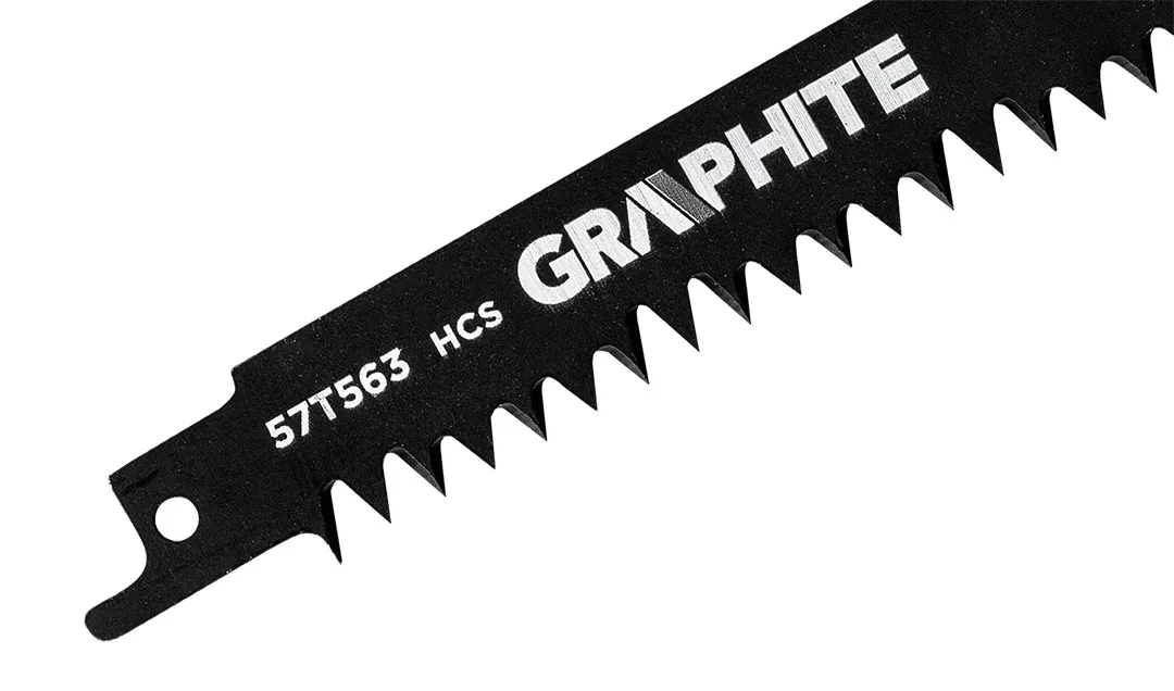 Brzeszczot do piły szablastej, HCS 240 x 19 x 1,5 mm, 5 TPI, 57T563 marki GRAPHITE to brzeszczot wykonany ze stali węglowej (HCS), o długości całkowitej 240 mm, szerokości 19 mm i grubości 1,5 mm. Posiada 5 zębów na cal (TPI) oraz rozstaw zębów 5 mm. Przeznaczony do prostego cięcia grubego drewna bez gwoździ i drewna opałowego o średnicy 15-190 mm, a także przycinania zielonego drewna ze średnicą <190 mm. Konstrukcja brzeszczotu GRAPHITE umożliwia szybkie oraz zgrubne cięcie.