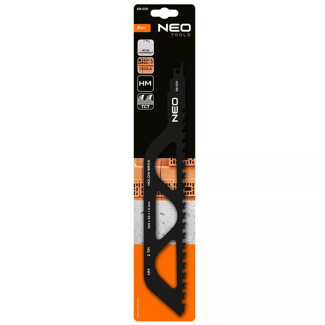 Brzeszczot do piły szablastej, 2 TPI, HM, długość całkowita 305 mm, szerokość 50 mm, grubość 1.5 mm, rozstaw zębów 12.7 mm, zastosowanie: cegła (<250 mm), beton komórkowy, precyzyjne cięcie pod kątem, ostrza z węglika spiekanego (HM)