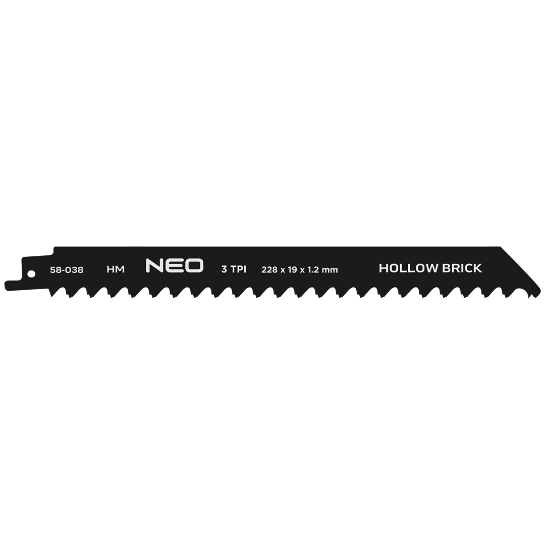 Brzeszczot do piły szablastej, 3 TPI, HM, długość całkowita 228 mm, szerokość 19 mm, grubość 1.2 mm, rozstaw zębów 8.5 mm, zastosowanie: cegła (<170 mm), beton komórkowy, tworzywo sztuczne wzmocnione włóknem szklanym (<150 mm), precyzyjne cięcie pod kątem, ostrza z węglika spiekanego (HM)