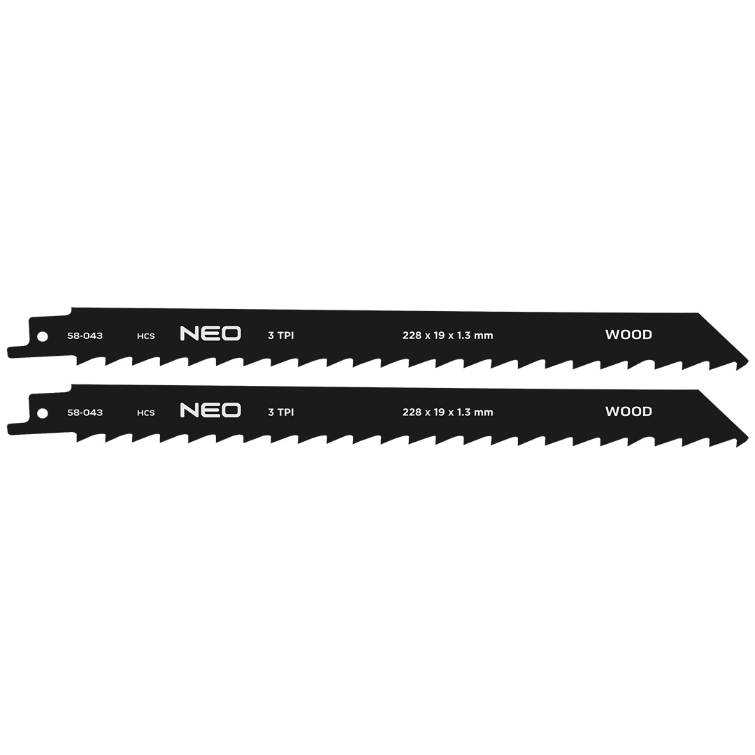 Brzeszczot do piły szablastej, 3 TPI, HCS, 2 sztuki w komplecie, długość 228 mm, szerokość 19 mm, grubość 1.3 mm, rozstaw zębów 8.5 mm, zastosowanie: gałęzie, drewno bez gwoździ (20–175 mm), drewno opałowe/drewno kominkowe/drewno świeże (średnica 20–175 mm), cięcie proste, cięcie zgrubne