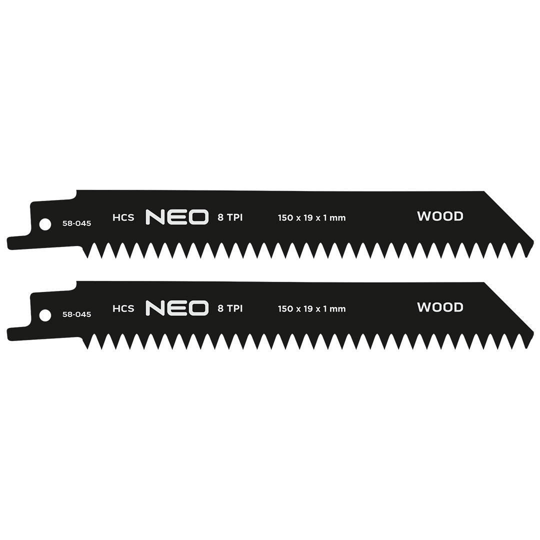 Brzeszczot do piły szablastej, 8 TPI, HCS, 2 sztuki w komplecie, długość 152 mm, szerokość 19 mm, grubość 1 mm, rozstaw zębów 3 mm, zastosowanie: drewno budowlane, sklejka, tworzywa sztuczne (6–100 mm), panele drewniane (<75 mm), płyty wiórowe, płyty MDF (6–100 mm), cięcie proste