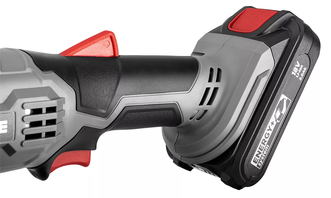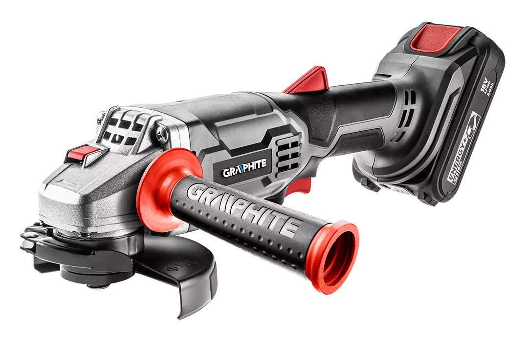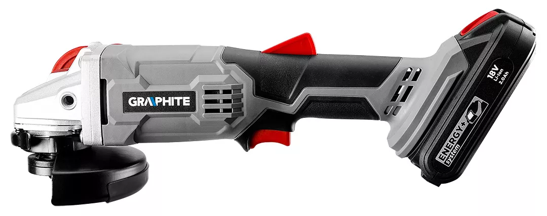 Szlifierka kątowa GRAPHITE, współpracująca z akumulatorami 18V Li-Ion GRAPHITE Energy+. Przystosowana do pracy z tarczami o średnicy 115 mm, osiąga prędkość 10000 obrotów na minutę. Szlifierkę wyposażono w dwuelementowy przycisk włącznika, zapewniający bezpieczeństwo i pełną kontrolę nad pracą urządzenia. Konstrukcja elektronarzędzia odznacza się wysoką ergonomią - przewężona część chwytowa została pokryta antypoślizgowym tworzywem, dzięki czemu szlifierka pewnie leży w dłoni. Dzięki płaskiej obudowie przekładni urządzeniem można pracować także w trudno dostępnych miejscach. Zabudowany przycisk blokady wrzeciona chroni użytkownika przed przypadkowym załączeniem blokady podczas pracy. Rozmieszczenie otworów wentylacyjnych poza strefą chwytu chroni silnik przed przegrzaniem. Regulacja położenia osłony tarczy odbywa się bez użycia narzędzi.