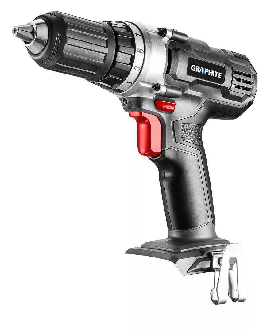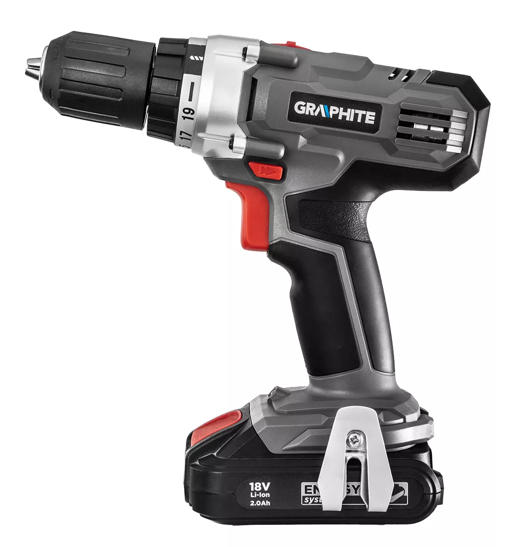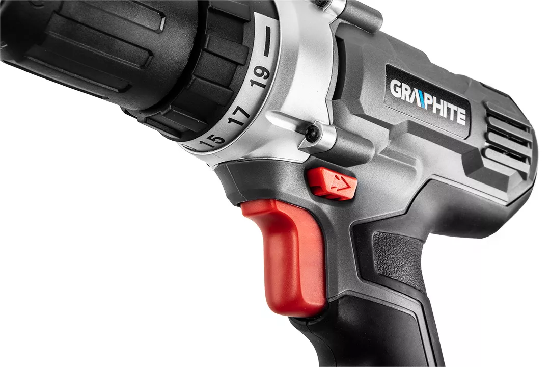 Dwubiegowa wiertarko-wkrętarka GRAPHITE, współpracująca z akumulatorami 18V Li-Ion GRAPHITE Energy+. Elektronarzędzie posiada płynną regulację prędkości obrotowej oraz zostało wyposażone w przełącznik kierunku obrotów. Samozaciskowy uchwyt pozwala na stosowanie osprzętu o średnicy 2-13 mm. Maksymalna prędkość obrotowa wrzeciona na pierwszym biegu wynosi 350, a na drugim 1250 obrotów na minutę. Maksymalny moment obrotowy wynosi 35 Nm (wkręcanie miękkie) / 55 Nm (twarde) i może być regulowany poprzez 19-stopniowe sprzęgło z dodatkową opcja wiercenia. Urządzenie wyposażono w elektryczny hamulec silnika i automatyczną blokadę wrzeciona. Dioda LED, uruchamiana automatycznie, podświetla miejsce pracy. Ergonomiczny kształt rękojeści i zwarta konstrukcja wiertarko-wkrętarki pozwalają na wygodną pracę także w trudnych warunkach. Rękojeść została pokryta materiałem antypoślizgowym, dzięki czemu elektronarzędzie pewnie leży w dłoni. Przekładnia planetarna została wykonana z wysokogatunkowej stali.