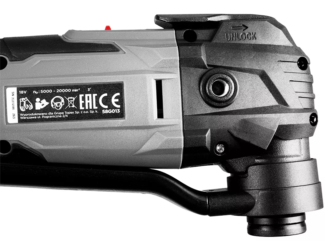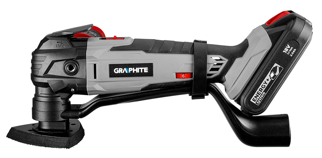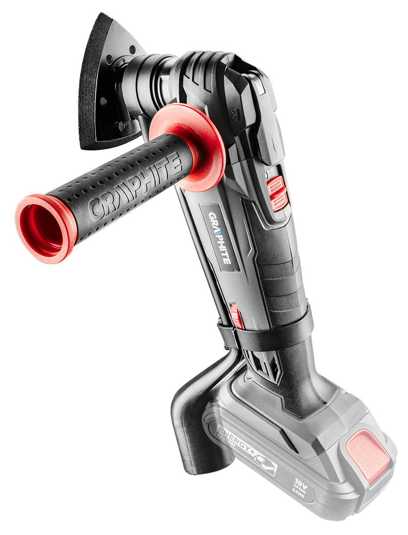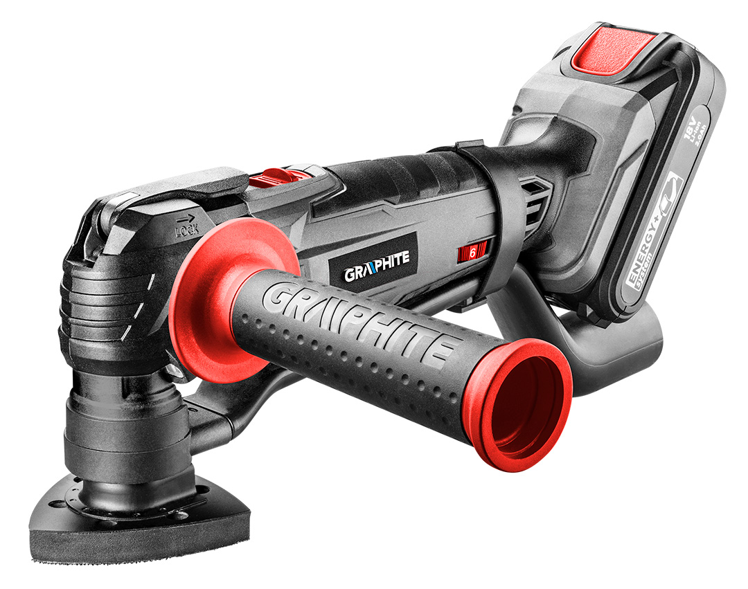 Urządzenie wielofunkcyjne GRAPHITE, współpracujące z akumulatorami 18V Li-Ion GRAPHITE Energy+. Jest to wszechstronne elektronarzędzie przeznaczone jest do cięcia, szlifowania lub skrobania materiałów takich jak: metal, drewno czy ceramika. Głowica urządzenia wykonuje od 5000 do 20000 oscylacji w ciągu minuty, kąt oscylacji wynosi 3°. Urządzenie wyposażono w system szybkiej i beznarzędziowej wymiany akcesoriów. Dzięki uniwersalnemu uchwytowi narzędziowemu użytkownik ma możliwość zastosowania różnorodnych końcówek roboczych marki GRAPHITE, jak również wielu akcesoriów innych marek. Obudowa przekładni urządzenia została wykonana z wytrzymałego stopu aluminium. W zestawie z elektronarzędziem znajduje się adapter odsysu pyłu, dający możliwość podłączenia odkurzacza podczas prac szlifierskich. Specjalnie wyprofilowana, ogumowana rękojeść zapewnia pewny chwyt oraz komfort użytkowania. Dla pewniejszego prowadzenia elektronarzędzia istnieje możliwość dwupozycyjnego montażu dodatkowej rękojeści. Miejsce pracy oświetlają dwie jasne diody LED.