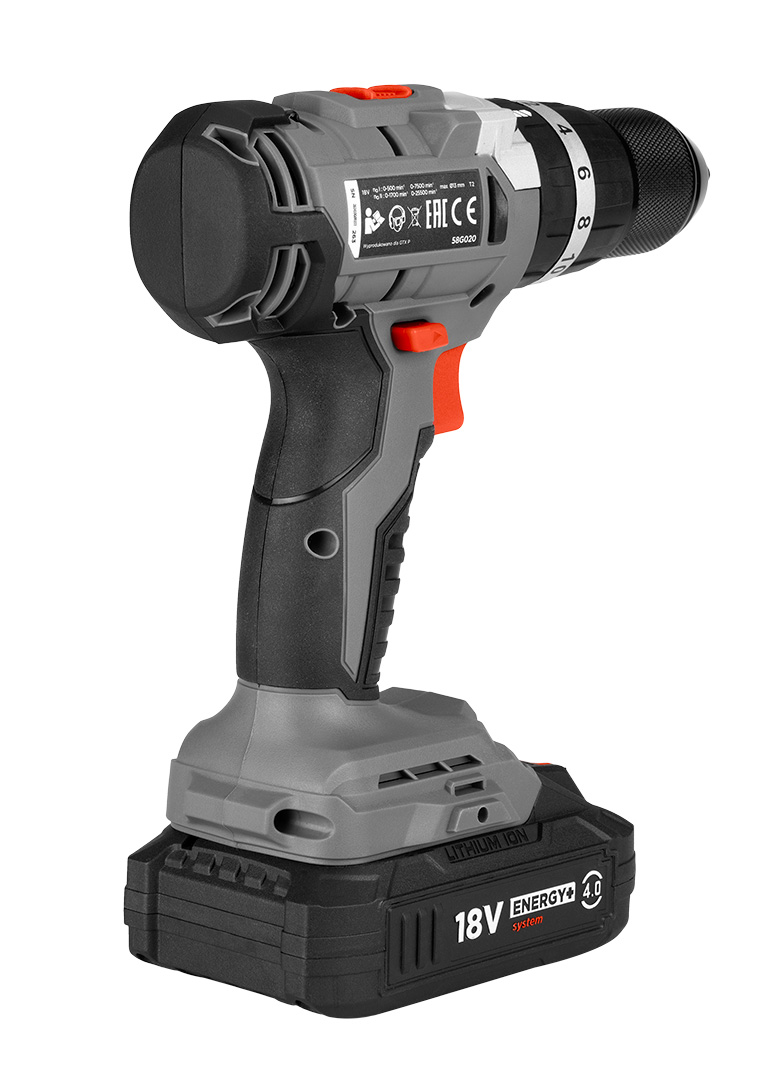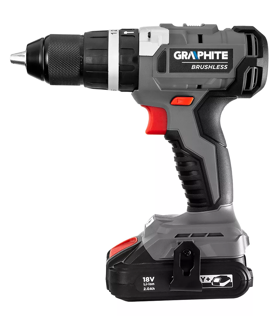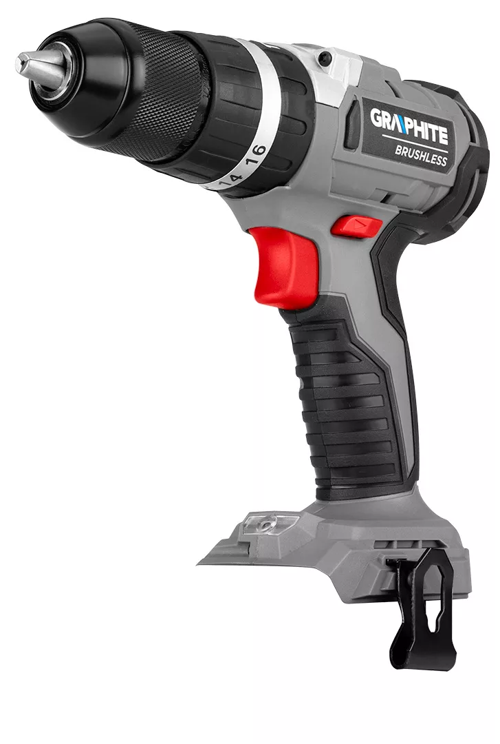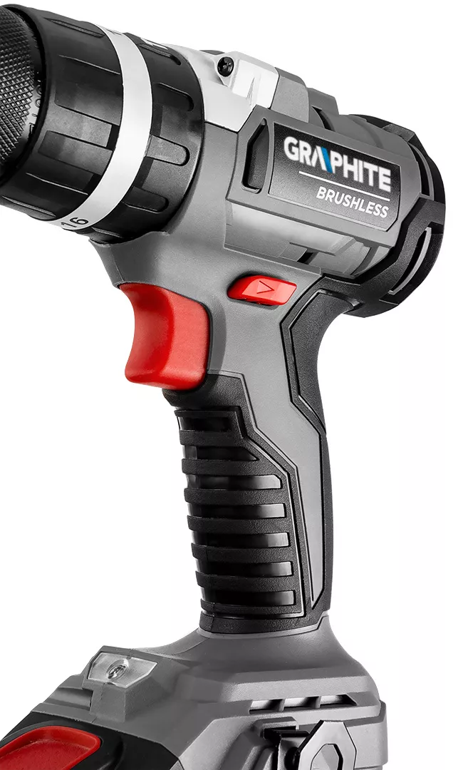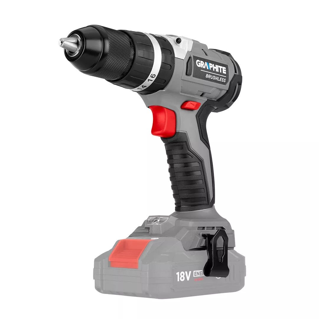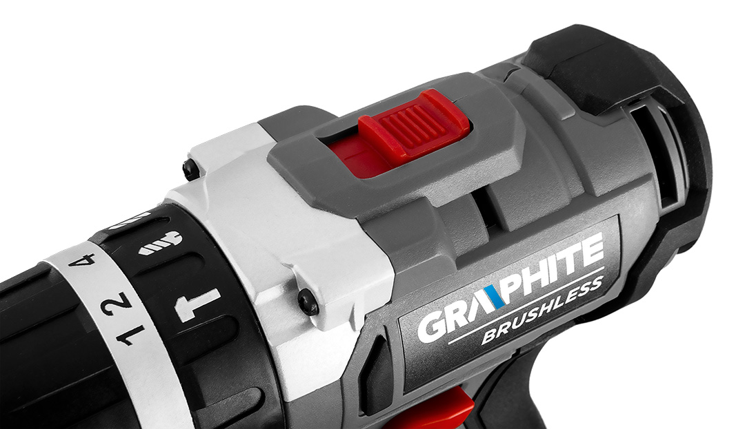 Dwubiegowa wiertarko-wkrętarka GRAPHITE, współpracująca z akumulatorami 18V Li-Ion GRAPHITE Energy+. W konstrukcji urządzenia zastosowano nowoczesny i wydajny silnik bezszczotkowy, który w porównaniu z konstrukcjami szczotkowymi charakteryzuje się dłuższym czasem pracy na jednym naładowaniu, większą kontrolą nad prędkością obrotową oraz mniejszymi wymiarami, co przekłada się na bardziej zwartą i kompaktową budowę całego urządzenia. Ponadto silnik jest bardziej odporny na pracę w trudnych warunkach, np. w dużym zapyleniu oraz lepiej odprowadza ciepło, przez co pozwala na bardziej intensywną pracę pod większym obciążeniem. Przekładnia planetarna została wykonana z wysokogatunkowej stali. Maksymalna prędkość obrotowa wrzeciona na pierwszym biegu wynosi 500, a na drugim 1700 obrotów na minutę. Maksymalny moment obrotowy wynosi 38 Nm (wkręcanie miękkie) / 58 Nm (twarde) i może być regulowany poprzez 16-stopniowe sprzęgło z dodatkowymi opcjami wiercenia oraz wiercenia z udarem. Samozaciskowy metalowy uchwyt pozwala na stosowanie osprzętu o średnicy 2-13 mm. Urządzenie wyposażono w elektryczny hamulec silnika i automatyczną blokadę wrzeciona. Dioda LED, uruchamiana automatycznie, podświetla miejsce pracy. Ergonomiczny kształt rękojeści i zwarta konstrukcja wiertarko-wkrętarki pozwalają na wygodną pracę także w trudnych warunkach. Rękojeść została pokryta materiałem antypoślizgowym, dzięki czemu elektronarzędzie pewnie leży w dłoni.
