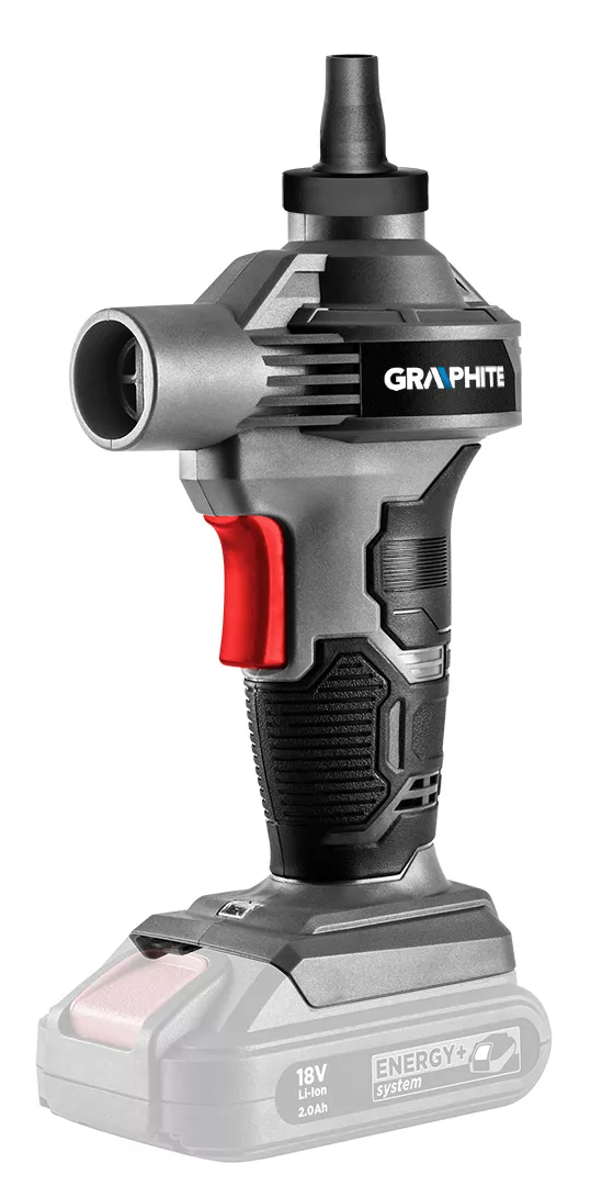 Pompka akumulatorowa Energy+ 18V GRAPHITE współpracująca z akumulatorami 18V Li-Ion Energy+. Przystosowana jest do nadmuchiwanych elementów za pomocą zaworu śrubowego; do elementów nadmuchiwanych z zaworem do wypompowania powietrza. Konstrukcja elektronarzędzia odznacza się wysoką ergonomią. Uchwyt jest pokryty antypoślizgowym materiałem, dzięki czemu kompresor pewnie leży w dłoni. W zestawie są 3 różne końcówki.