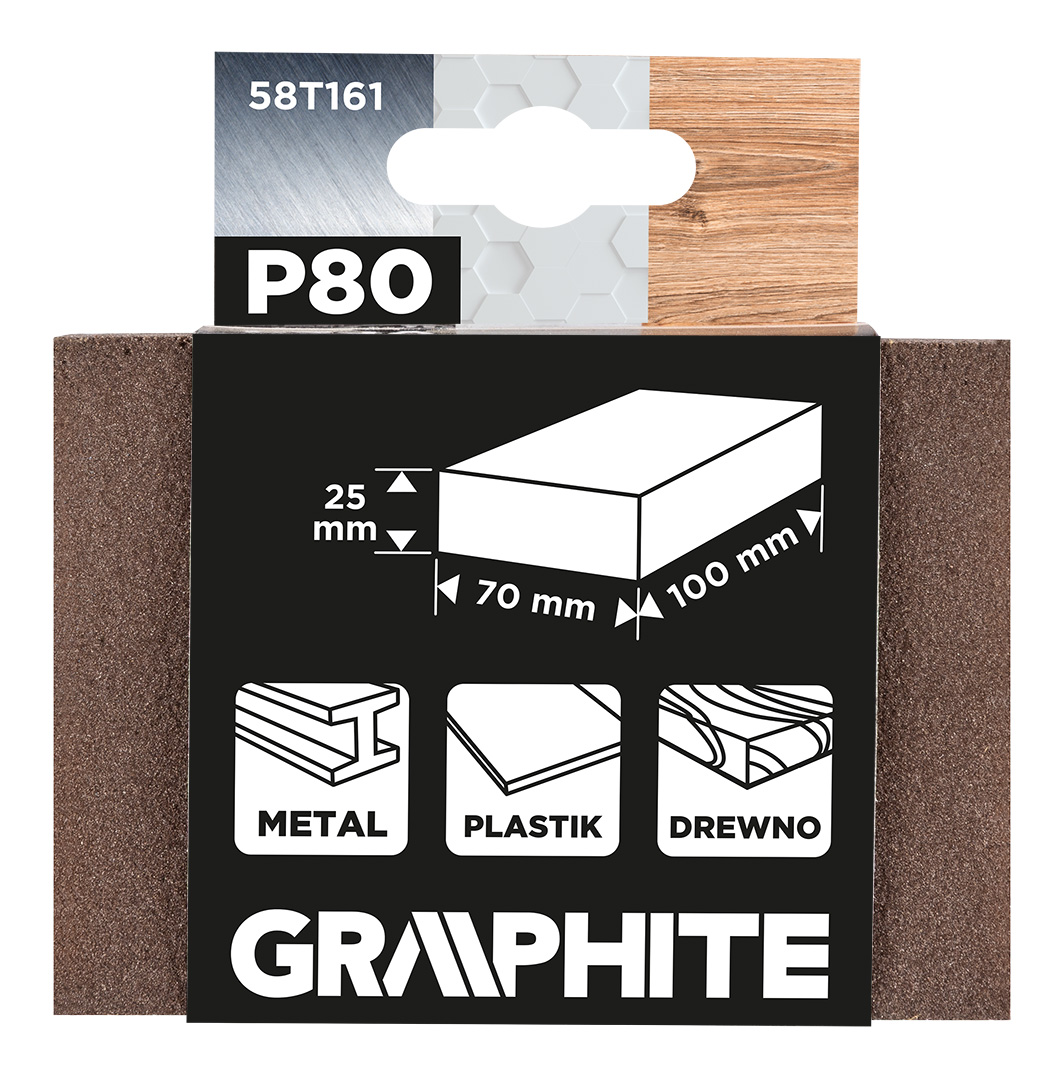 Gąbka ścierna 70 x 25 x 100 mm, P80, 58T161 marki GRAPHITE to gąbka przeznaczona do szlifowania ręcznego i wykończeniowego. Stosowana do wygładzania szpachli, gładzi, gipsów, farb, tworzyw sztucznych, drewna, metalu oraz powłok lakierniczych. Nasyp ścierny wykonany z elektrokorundu znajduje się po czterech stronach gąbki. Miękka struktura umożliwia dopasowanie do kształtu szlifowanej powierzchni, a w przypadku trudno dostępnych miejsc - gąbkę można łatwo przyciąć na mniejsze kawałki. Dzięki swojej grubości i elastyczności gąbka ścierna GRAPHITE równomiernie rozkłada nacisk dłoni, co pozwala uniknąć miejscowych zagłębień oraz rys.