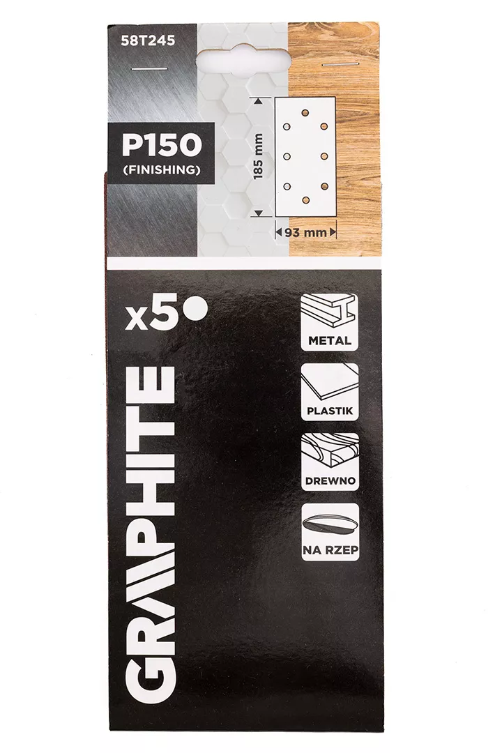 Papiery ścierne na rzep 93 x 185 mm, P150, 5 sztuk, z 8 otworami 58T245 marki GRAPHITE to papier przeznaczony do szlifowania metalu, drewna i tworzyw sztucznych. Posiada 8 otworów umożliwiających efektywne odprowadzanie pyłu podczas pracy. Do jego produkcji zastosowano bazę z papieru typu C, odpowiedniego do szlifowania maszynowego. Powierzchnia pokryta jest nasypem półotwartym z elektrokorundu, gdzie ziarno ścierne stanowi 100% pokrycia. Mocowanie na rzep ułatwia szybką i wygodną wymianę papieru marki GRAPHITE podczas pracy.