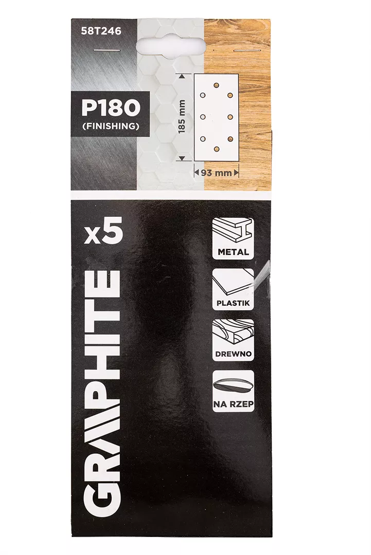 Papiery ścierne na rzep 93 x 185 mm, P180, 5 sztuk, z 8 otworami 58T246 marki GRAPHITE to papier przeznaczony do szlifowania metalu, drewna i tworzyw sztucznych. Posiada 8 otworów umożliwiających efektywne odprowadzanie pyłu podczas pracy. Do jego produkcji zastosowano bazę z papieru typu C, odpowiedniego do szlifowania maszynowego. Powierzchnia pokryta jest nasypem półotwartym z elektrokorundu, gdzie ziarno ścierne stanowi 100% pokrycia. Mocowanie na rzep ułatwia szybką i wygodną wymianę papieru marki GRAPHITE podczas pracy.