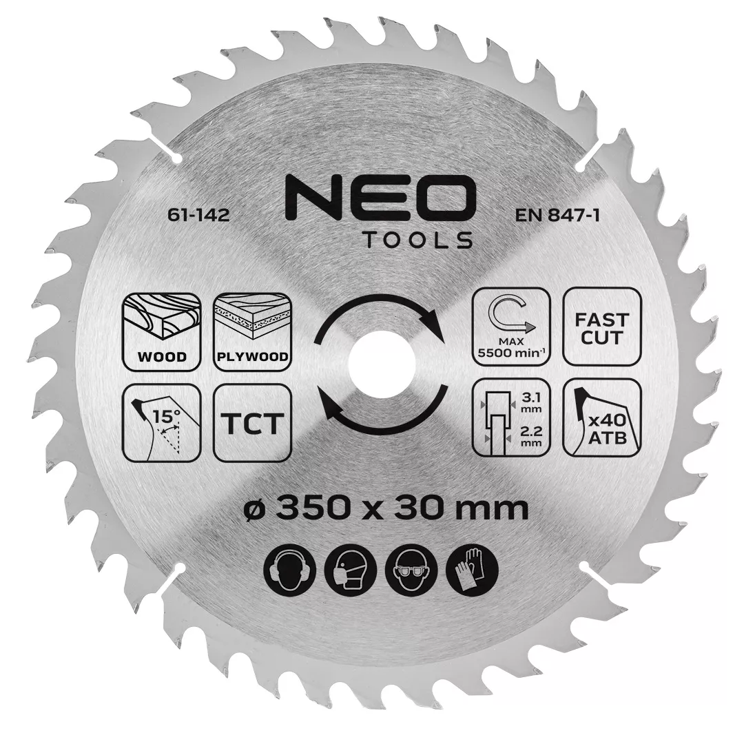 Tarcza do pilarki, widiowa, 350 x 30 mm, 40 zębów 61-142 marki NEO TOOLS wyposażona została w 40 zębów o wymiarach 3,1 mm x 2,2 mm, wykonanych z węglika spiekanego. Ząb ATB, o specjalnej geometrii naprzemianległej, gwarantuje zwiększoną dokładność cięcia. Tarcza marki NEO TOOLS ze stali manganowej MN65 osiąga maksymalną prędkość obrotową do 5 500 obr./min. W zestawie znajdują się trzy pierścienie, umożliwiające redukcje do wymiarów: 30 x 25,4 mm, 30 x 20 mm i 30 x 16 mm. Tarcza NEO TOOLS przeznaczona jest do cięcia drewna, materiałów drewnopochodnych, sklejek, laminatów, MDF. Narzędzie zapewnia szybką i precyzyjną pracę.
