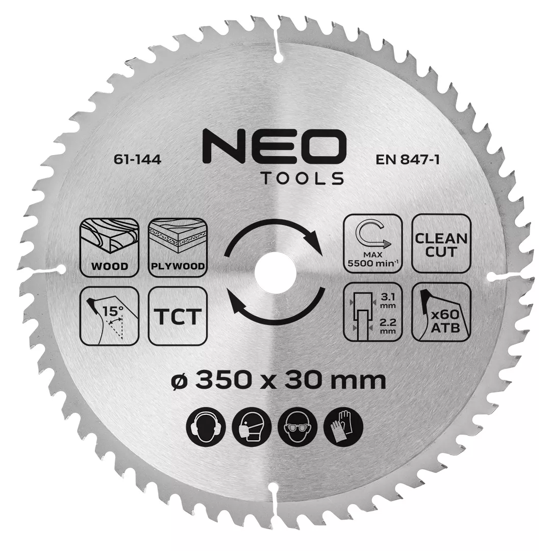 Tarcza do pilarki, widiowa, 350 x 30 mm, 60 zębów 61-144 marki NEO TOOLS wyposażona została w 60 zębów o wymiarach 3,1 mm x 2,2 mm, wykonanych z węglika spiekanego. Ząb ATB, o specjalnej geometrii naprzemianległej, gwarantuje zwiększoną dokładność cięcia. Tarcza marki NEO TOOLS ze stali manganowej MN65 osiąga maksymalną prędkość obrotową do 5 500 obr./min. W zestawie znajdują się trzy pierścienie, umożliwiające redukcje do wymiarów: 30 x 25,4 mm, 30 x 20 mm i 30 x 16 mm. Tarcza NEO TOOLS przeznaczona jest do cięcia drewna, materiałów drewnopochodnych, sklejek, laminatów, MDF. Narzędzie zapewnia czystą i precyzyjną pracę.