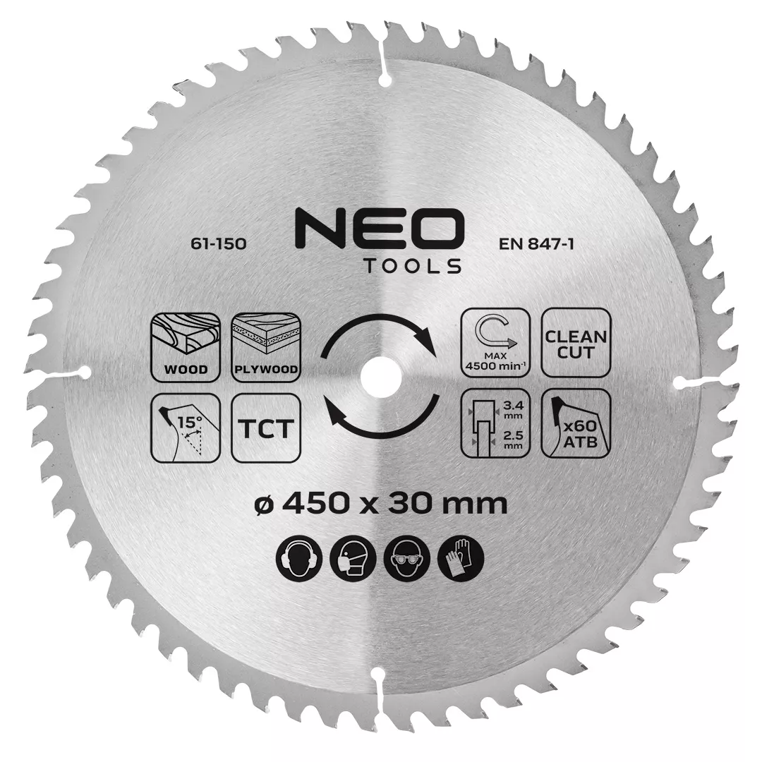 Tarcza do pilarki, widiowa, 450 x 30 mm, 60 zębów 61-150 marki NEO TOOLS wyposażona została w 60 zębów o wymiarach 3,4 mm x 2,5 mm, wykonanych z węglika spiekanego. Ząb ATB, o specjalnej geometrii naprzemianległej, gwarantuje zwiększoną dokładność cięcia. Tarcza marki NEO TOOLS ze stali manganowej MN65 osiąga maksymalną prędkość obrotową do 4 500 obr./min. W zestawie znajdują się trzy pierścienie, umożliwiające redukcje do wymiarów: 30 x 25,4 mm, 30 x 20 mm i 30 x 16 mm. Tarcza NEO TOOLS przeznaczona jest do cięcia drewna, materiałów drewnopochodnych, sklejek, laminatów, MDF. Narzędzie zapewnia czystą i precyzyjną pracę.
